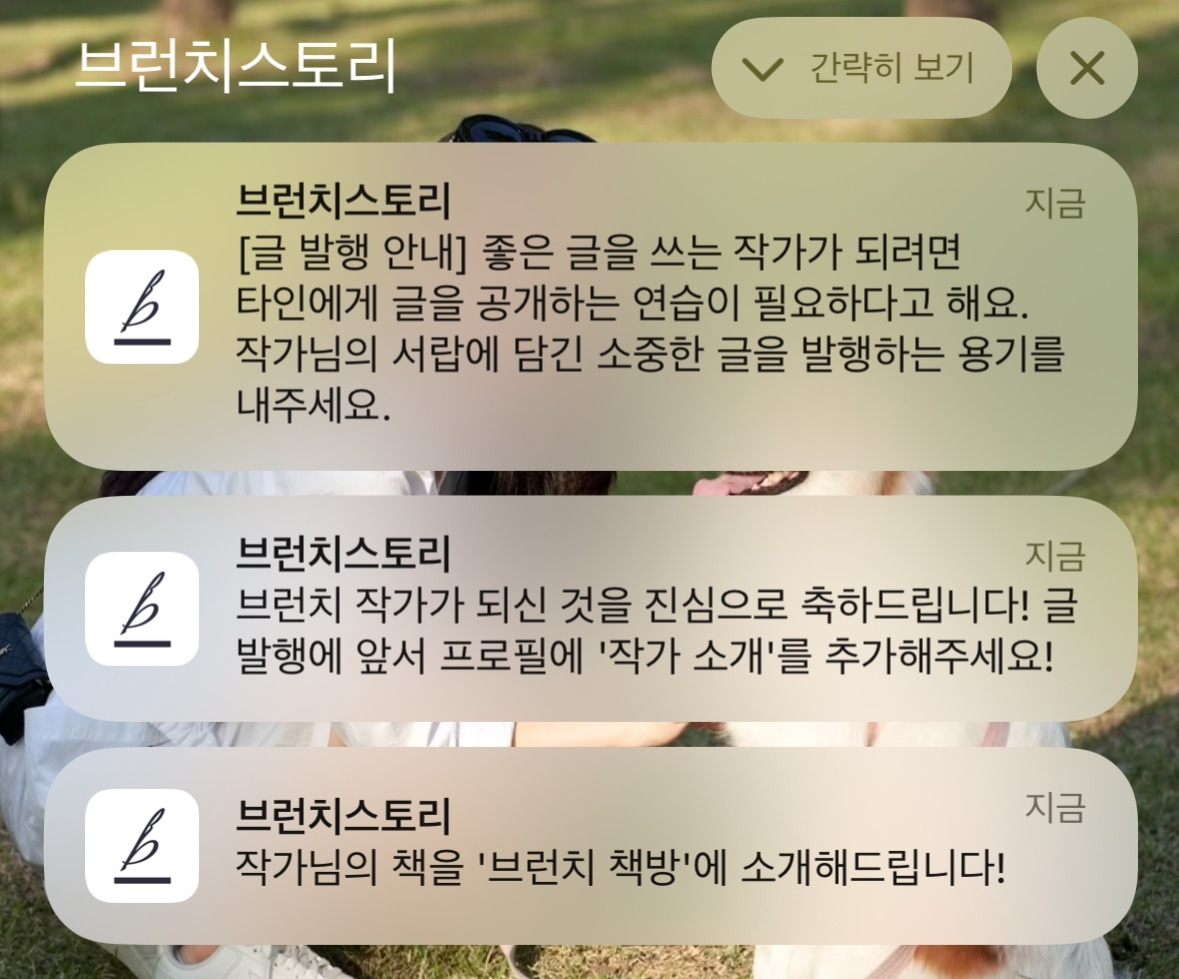 모임에 나와서 열심히 퇴고한 3편의 글과 제한된 분량 안에서 나를 가장 잘 드러낼 수 있도록 정성스레 다듬은 소개글을 담아 작가 신청을 누른 날을 기억한다. 그리고 다음 날 연속적인 3개의 알람 소리에 잠이 깼다. 평소 같았으면 짜증이 날 법도 한데, 왠지 기분이 좋았다. Yesssss!!! 작가 승인이 되었다는 메세지를 확인하고 바로 모임 단톡방에 달려가 소식을 알렸다. 모두가 진심으로 축하해 줬고, 그리고 역시나, 우리 모임 동기들 모두 작가가 되었다. 더 이상 오프라인에서 시간을 잡고 만나서 글을 쓰지는 않지만 우리는 여전히 브런치스토리라는 공간에서 서로의 글을 지켜보고 응원한다.