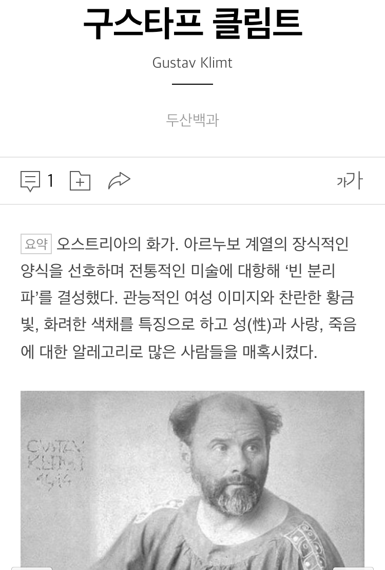 바라보는 것만으로도 누구나 그림을 느낄 수 있다. ‘황금색의 마술사’라고 불리기도 했다는 클림트는 황금색을 사용했다. 그래서 그림이 스스로 빛을 내는 듯한 묘한 기분이 든다. 또 한 가지 유명한 그림인 유디트를 꽤 오랫동안 감상해본다.