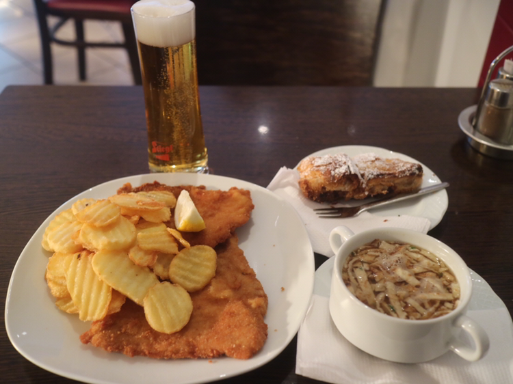 떨어져가는 에너지를 붙잡으며 나는 다시 시내로 향했다. 어찌 됐든 현지식 슈니첼을 먹기위한 생각으로 거리를 둘러봤다. 겨우 찾은 곳에서 나는 슈니첼을 주문했다. 슈니첼은 우리나라의 돈까스와 비슷하다. 돼지고기 혹은 닭고기에 튀김옷을 입혀 튀긴 요리이다. 레몬즙을 뿌려서 먹는다. 세트메뉴를 주문했는데 매우 짰던 스프와 애플파이, 그리고 슈니첼이 나왔다. 푸짐한 양은 배고픈 내 뱃속을 만족시켰다.