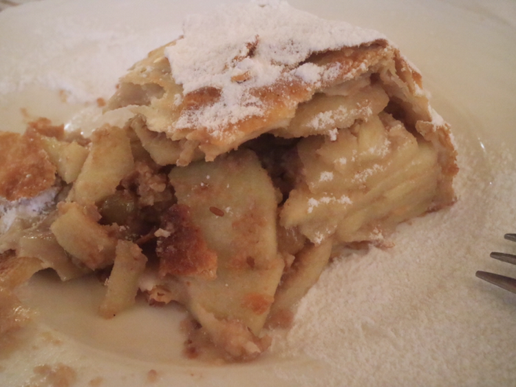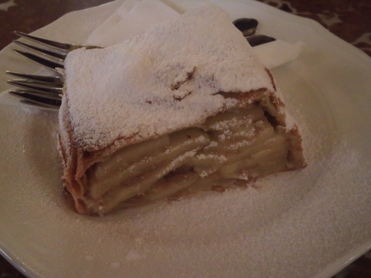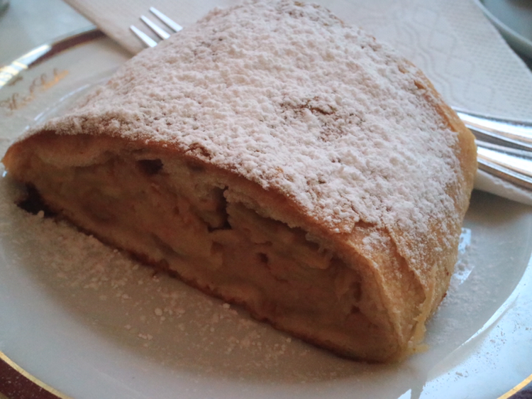 그리고 이곳에서는 우리에게 비엔나 커피로 많이 알려진 아인슈페너를 주문했다. 블랙커피 위해 휘핑크림이 올라간 형태의 커피이다. 찻잔과 함께 담겨진 커피 그리고 휘핑크림이 예쁘다. 달콤한 휘핑크림과 함께 입 안으로 들어오는 꽤 진한 커피의 맛이 좋다. 함께 주문한 애플파이 아펠슈트루델도 맛본다. 애플파이 안의 사과가 살아있다.
