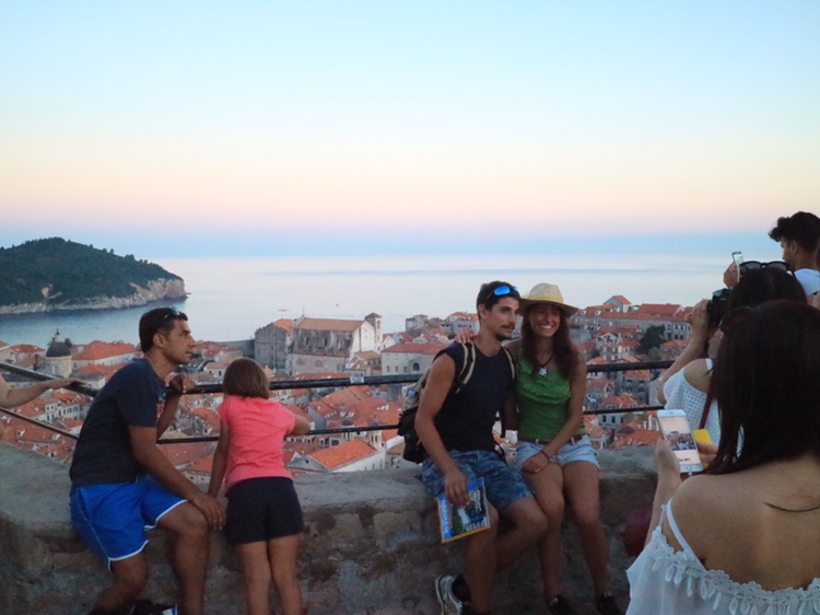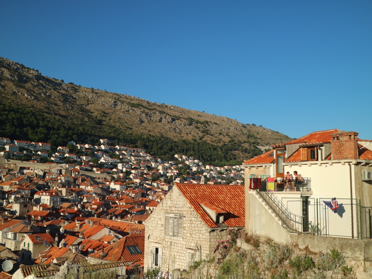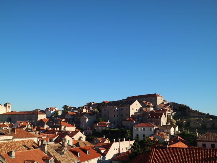 근처 붉은색 지붕의 2층 테라스에 남녀가 보인다. 아래에 영국 국기가 보인다. 숙소에서 바로 이 아름다운 풍경을 그대로 느끼고 있는 관광객들이다. 두브로브니크를 비추고 있는 태양은 붉은색 지붕을 비춰 지붕이 아름다운 빨간빛을 낼 수 있게 한다. 그리고 검푸른 아드리아 해를 비춰 그 푸르름을 세상에 알리며 푸른 하늘도 이 조화에 함께 할 수 있도록 돕는다. 두브로브니크를 비추는 태양은 여러 가지 멋진 역할을 아주 여유롭게 해내고 있는 듯하다.
