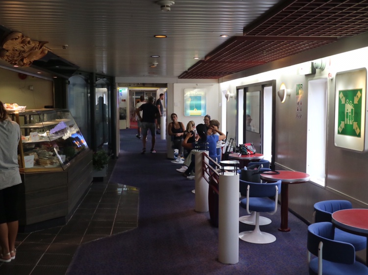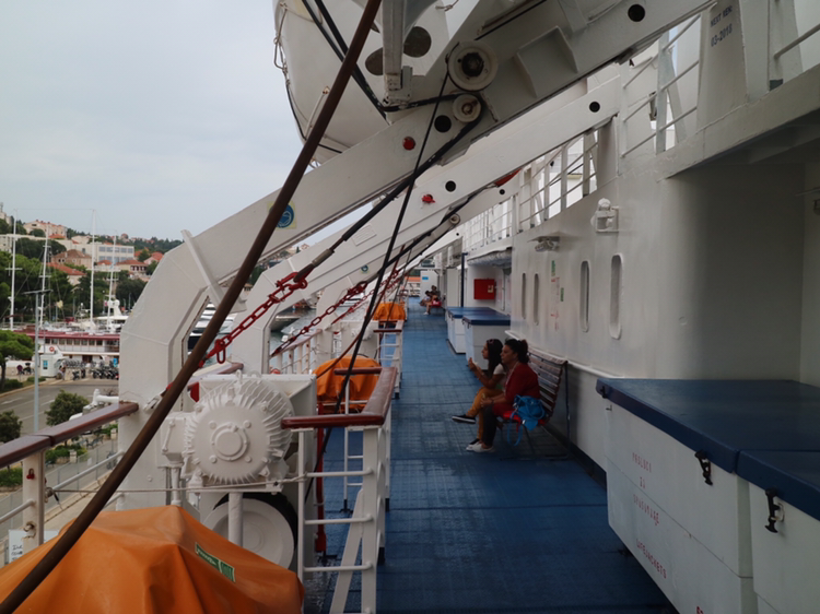 이탈리아 바리까지는 7시간 반이 걸린다. 내가 예약한 좌석은 Deck이다. 선실은 두 배정도 비싸다. 12시에 타서 오후 7시 반에 도착하니 Deck면 충분하다. 일찍 배에 오른 덕분에 괜찮은 자리를 잡았다. Deck자리는 바닥에 부착된 테이블과 의자 또는 페리 안의 레스토랑 같은 곳에 앉아도 된다. 레스토랑 또는 Bar에 있는 자리를 보자 잠시 탐이 났지만 이내 내 자리가 더 좋다고 생각을 바꾼다. 거긴 너무 시끄럽다. 조용하게 아드리아 해를 감상할 수 있는 내 자리가 좋다.