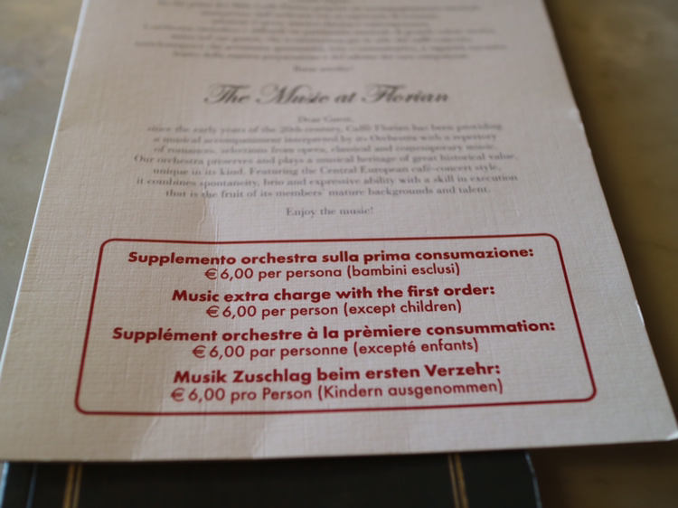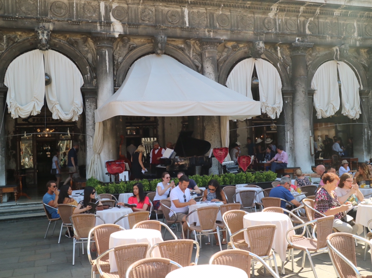 오케스트라 주위에는 많은 외부 테이블이 있다. 밖에서 주문한 사람들은 이 작은 오케스트라와 더 가까이 앉아 음악을 감상하며 커피를 맛본다. 드넓은 산 마르코 광장의 중심이 이곳인 것처럼 느껴진다.