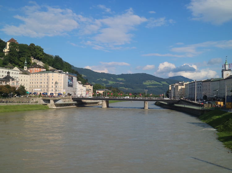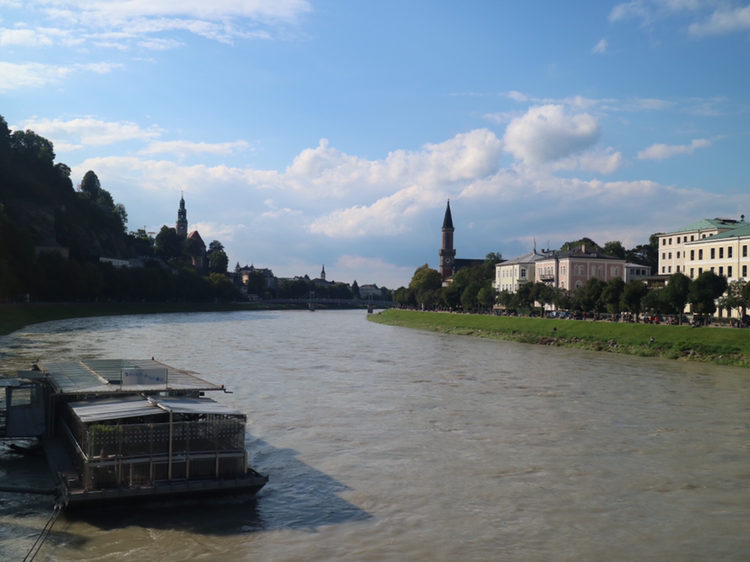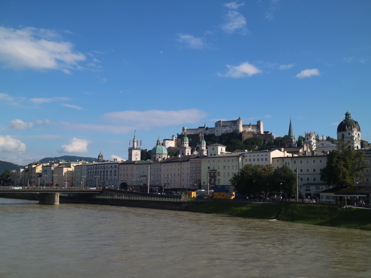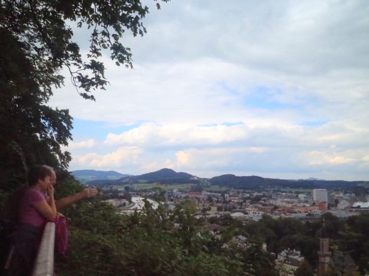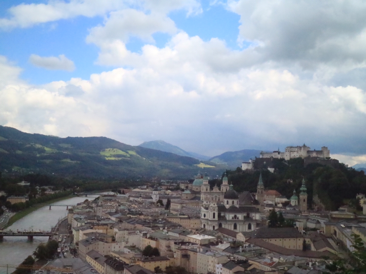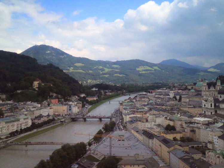 잘츠부르크 시내가 잘 내려다보이는 곳을 찾았다. 먼저 찾은 곳은 호엔잘츠부르크 요새다. 구시가에서 가장 높은 묀히스베르크 산의 정상에 있다. 함께 오른 관광객들과 함께 잘츠부르크를 내려다보며 감상한다. 오늘 새벽까지 비가 와서 잘자흐 강의 물이 흙탕물이다. 그래도 도시는 아름답기만 하다. 멀리 보이는 녹색의 산과 그 위의 하늘색 산은 멋진 조화를 이룬다.