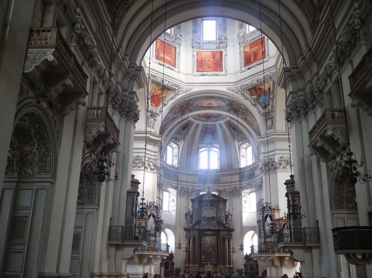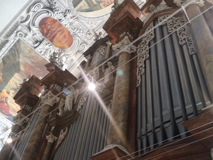 시내 안쪽으로 설어 대성당 지구로 갔다. 마침 잘츠부르크의 페스티벌 기간이라 대성당 지구 곳곳에는 무대가 설치되어 있다. 성당 안의 화려함을 둘러본 후 6,000개의 파이프로 만든 파이프 오르간도 구경했다. 이 성당은 1만 명을 수용할 정도의 규모로 서유럽 최대 규모라고 한다.