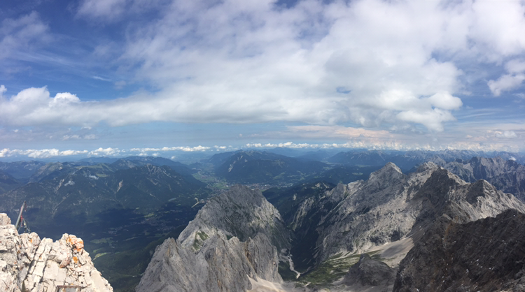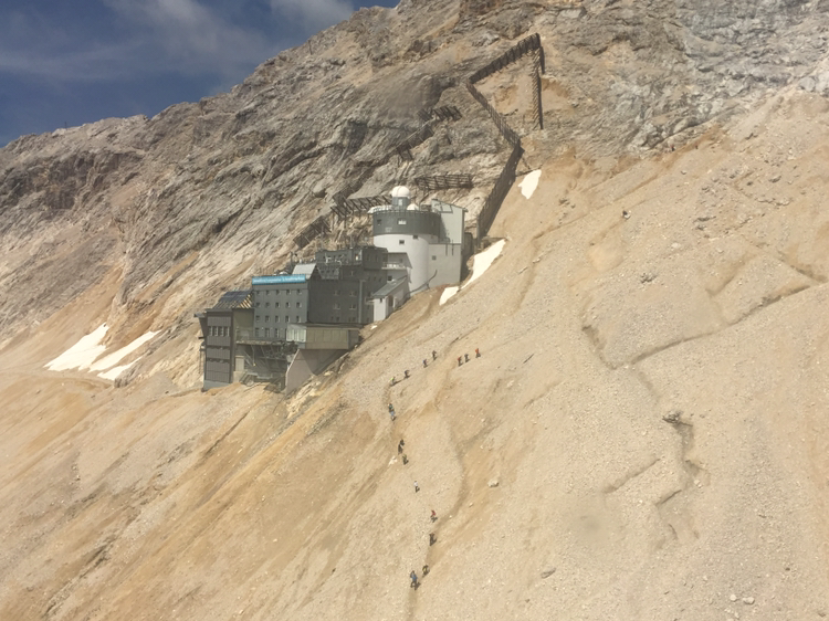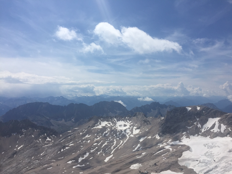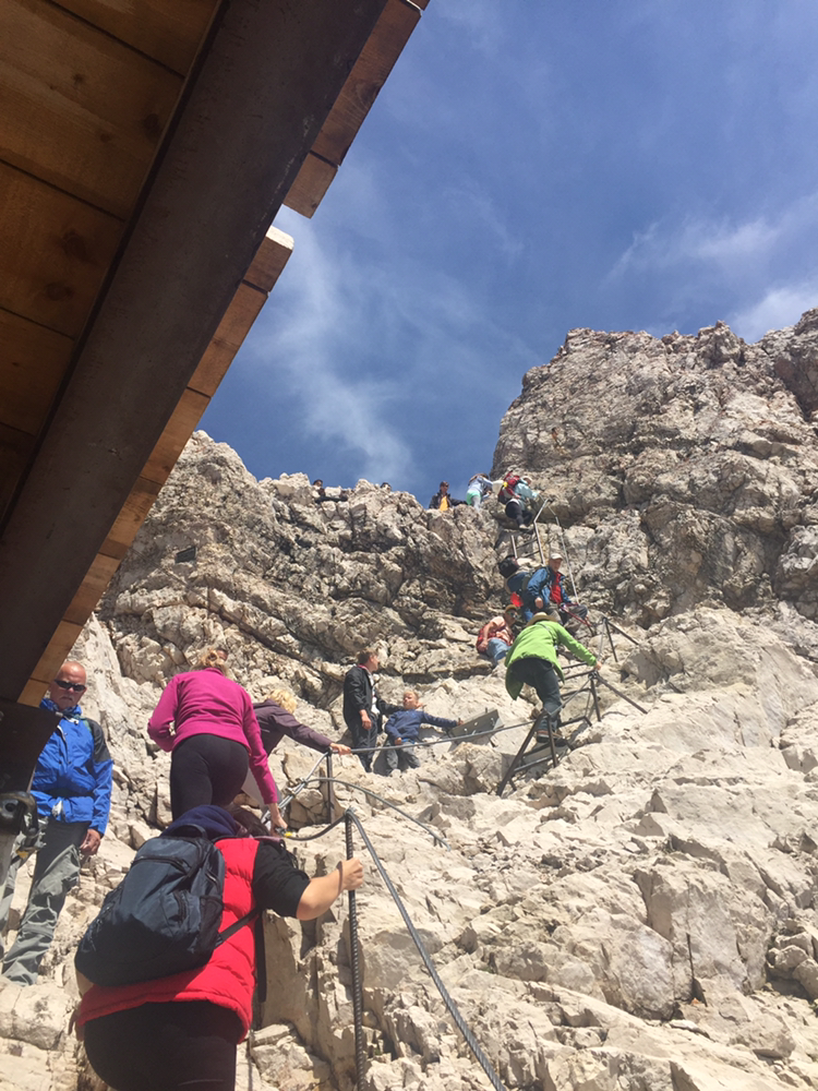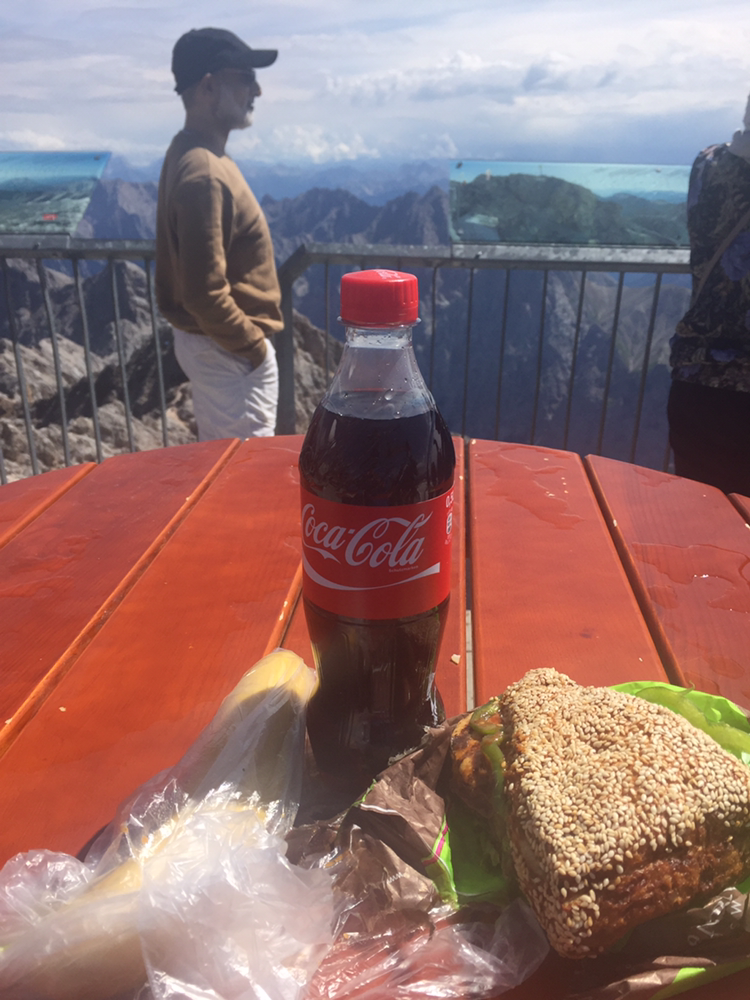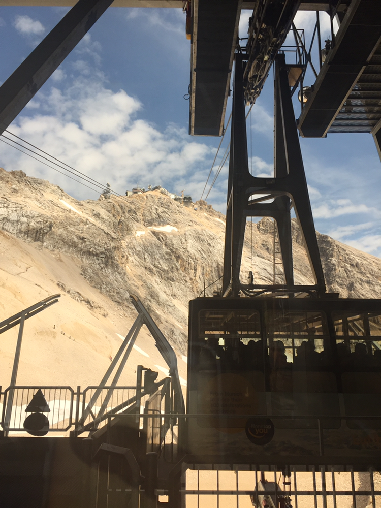 케이블카를 타고 내리긴 했는다. 진짜 독일의 정상에 오르려면 손과 발로 등반을 더 해야 한단다. 그곳에 오른 사람들은 위태롭게 보이는 곳에서 두 손을 번쩍 들어 사진을 찍어댔다. 나는 고민했다. 여기까지 와서 독일의 정상에 오른 거라고 할 수 있을까. 고민은 하지만 힘 빠진 내 다리가 동의해주지 않는다. 보기에도 위험해 보이는 등산 코스이다. 눈으로 보일만큼 짧은 코스지만 엄두가 나질 않는다. 우선 점심으로 준비한 샌드위치를 먹으며 생각해보로 한다. 어쨌든 이 높은 곳에서 아름다운 자연을 감상하며 맛보는 음식은 꿀맛이다. 여기는 해발 2,962m이다.