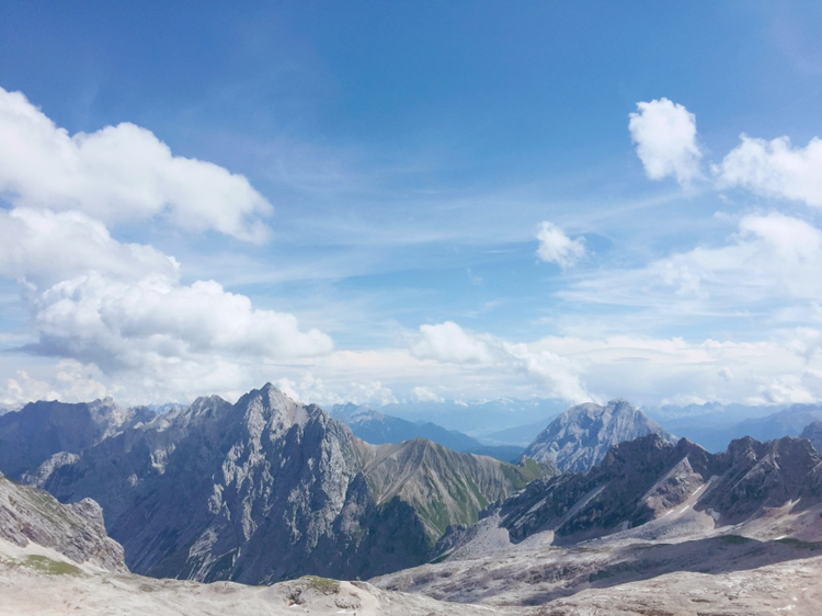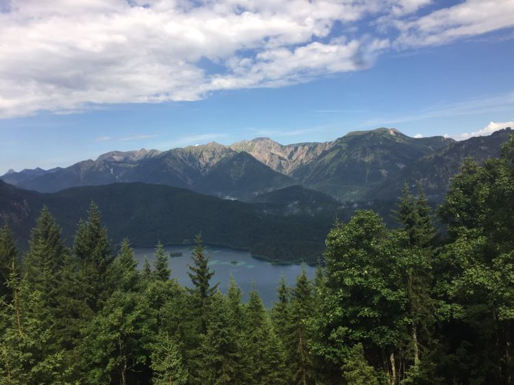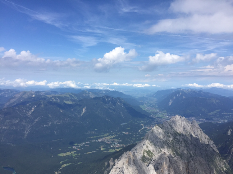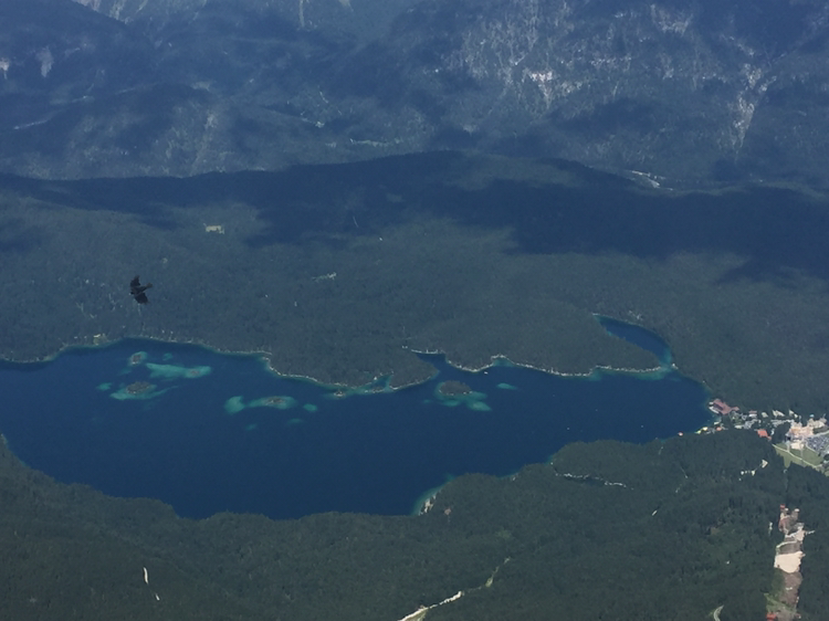 케이블카를 타고 다시 독일의 정상으로 향한다. 가능 길에 마치 거대한 자연의 일부로서 작은 사람들이 보였다. 등산으로 이 높은 곳까지 오르는 사람들이 멀리 보였다. 케이블카에서 내리니 눈이 부시다. 흐린 날씨는 언제 그랬냐는 듯 도망갔다. 뭉게구름과 드넓게 펼쳐진 산맥들이 자연의 아름다움을 뽐냈다. 아래쪽으로 보이는 아이브 호수의 모습이 정말 그림 같다. 수채와 물감을 그대로 풀어놓은 듯 아름답다. 보는 것만으로도 청명 해지는 느낌이다. 카페라 셔터를 누르자 마치 헬기를 타고 사진을 찍은 것 같다.