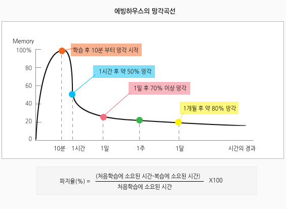 여기서 잠깐 ‘인간은 망각의 동물이다.’라고 표현하는 주장을 뒷받침하는 근거인 독일의 심리학자 에빙하우스의 망각 곡선을 살펴보자.
