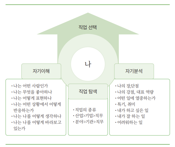 알아야 할 것들을 정리하면 크게 두 가지로 나눌 수 있다. 첫째로 자신에 대해 알아야 한다. 자신을 아는 것은 자아상, 자아정 체성, 가치관 등 다양한 면이 있겠지만, 간단하게 정리하면 ‘자기 이해’와 ‘자기 분석’이 필요하다. 자기 이해는 자신을 어떤 사람이라고 생각하는지, 어떻게 표현할 수 있을지, 어떤 상황에서는 어떤 면이 드러나는지, 무엇을 중요하게 생각하는지 등에 관한 것이다. 자기 분석은 장점, 강점, 역량 등을 말한다. 또 자기 분석에는 지금까지 자신이 선택해 온 정보들도 포함된다. 예를 들어 현재 자신의 전공, 결과나 성과가 좋았던 과목 같은 것들이다.