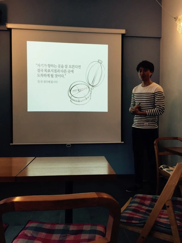 나는 퇴사 후 카페를 인수했다. 그 목적은 여러 가지가 있었다. 첫째, 생활비를 벌어야 했다. 나는 이직을 한 것이 아니라 퇴직을 했기 때문에 생활비를 벌어야 했다. 서른이 넘어 집에서 용돈을 받을 수는 없었다. 사업을 해본 경험도 없었기 때문에 리스크를 줄이는 인수를 선택했다. 둘째, 사업을 해보고 싶었다. 직장생활 6년간의 경험을 통해서 내가 가진 내용물과 구성물의 가능성을 확인했다. 하지만 많은 경험에서 그렇듯이 경험의 영역에 따라 확인할 수 있는 것들도 달라진다. 그래서 나는 다른 영역에 나를 던져 나를 더 확인하고 싶었다. 사업이라는 것이 쉽지 않다고 했는데 시간적 기회를 만든 시점에서 나는 그 도전을 해보고 싶었다. 셋째, 내가 강연하고 코칭하는 카페를 만들고 싶었다. 나는 사람의 성장을 돕는 일을 하고 싶었다. 그 길로 가는 과정에서, 내가 퇴사 후 마련한 2년간의 방학에서 카페는 딱 맞는 플랫폼이었다. 그리고 그곳은 내가 설립하고자 했던 1인 기업, 의미공학연구소의 장소도 되었다. 또한 퇴사 시점에 나는 강사가 되는 것을 중요한 목표 중에 하나로 삼았다. 그러나 회사에서 프레젠테이션만 해본 나는 강사는 아니었다. 회사에서 프레젠테이션을 잘 했고 발표대회에서도 입상했었다는 자신감은 누군가와 소통하며 함께 성장을 해나가는 교육 역량과는 달랐다. 그래서 나는 강사로서의 역량을 키우기 위해 내가 만든 플랫폼에 나를 던졌다.