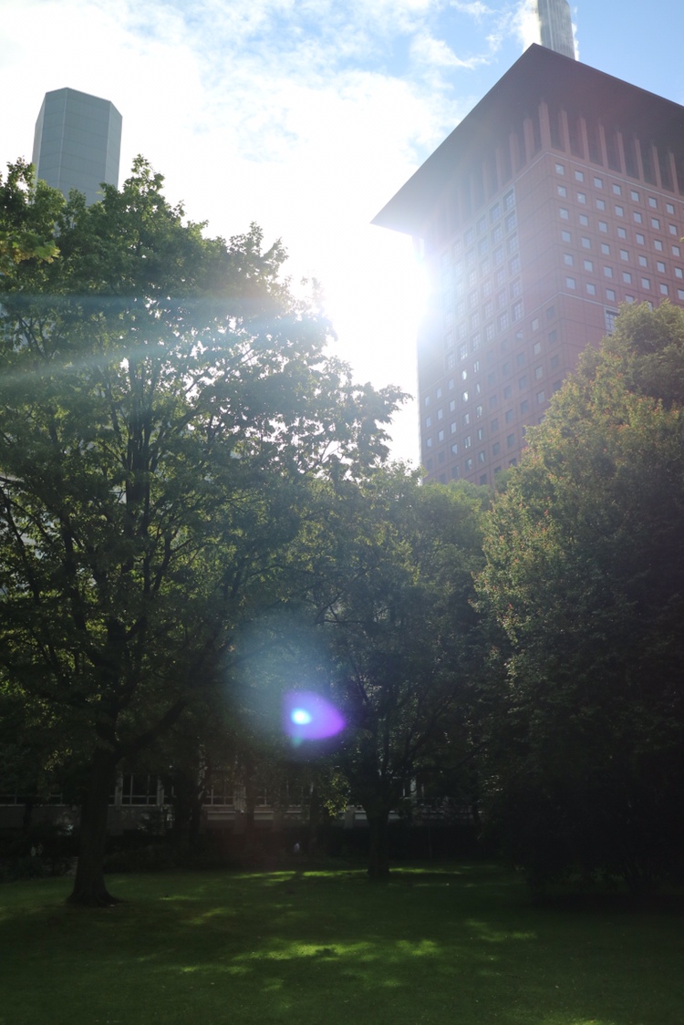 높은 건물들 사이로 이어진 타우누스 정원이 이어진다. 몇몇 동상과 조형물들을 볼 수 있다.