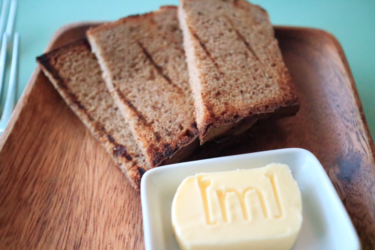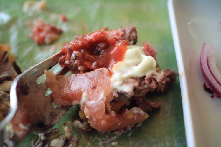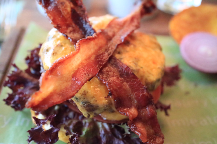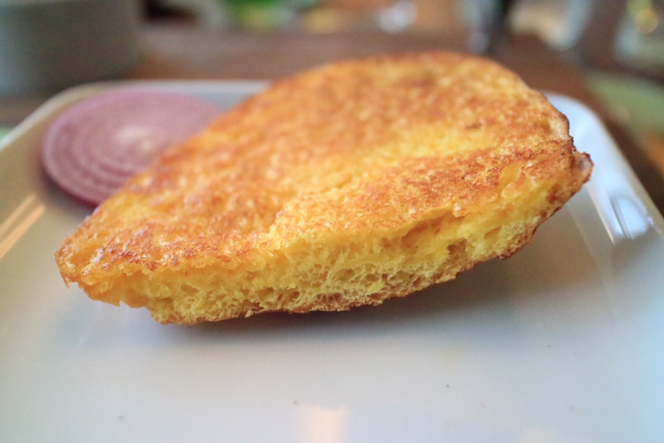 식전 빵이 나오고 드디어 주문한 함박스테이크가 나왔다. 우선 눈에 띄는 두 줄기의 베이컨을 잘라 맛본다. 고소한 훈제 베이컨 맛이 좋다. 바삭한 베이컨을 씹으며 함박스테이크를 이리저리 살펴본다. 옆에 있던 빵은 사실 햄버거의 위층 빵이었다. 이미 한 번 잘라먹고 난 뒤 다시 함박스테이크 위에 덮어본다. 빵 맛이 부드럽다. 보통의 햄버거 빵과 카스텔라의 부드러움의 중간 정도 느낌이다.