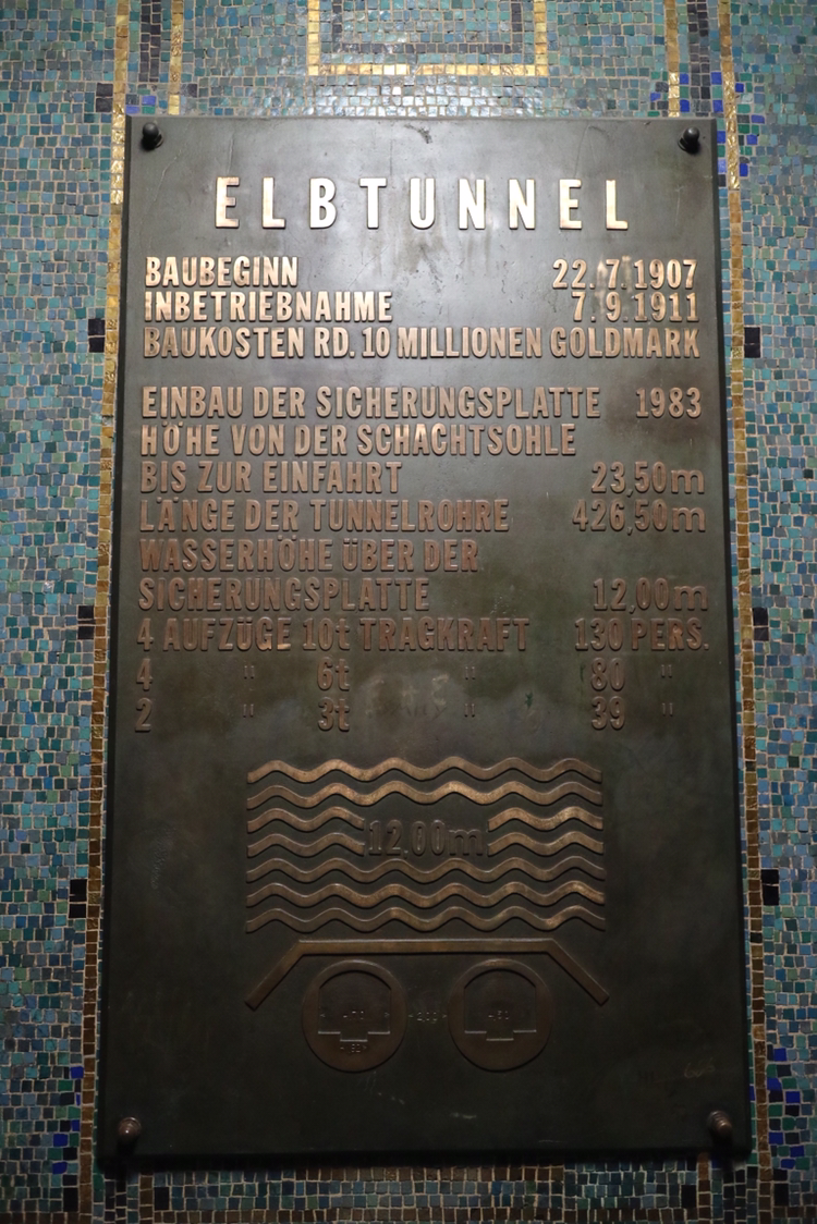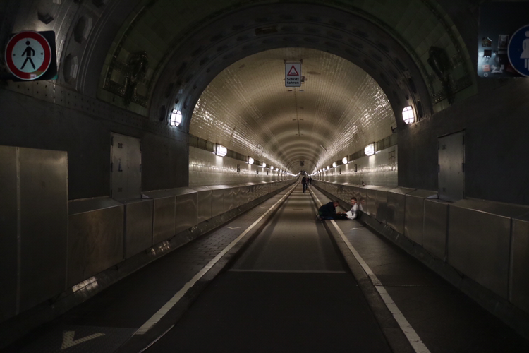 낮에 걸었던 길 역시 멋있다. 조금 지나다 보니 엘브 터널이라는 곳이 있다. 지도에서 본 이 터널을 사실 낮에는 찾지 못했었다. 밤에 그냥 걷다가 발견했다. 이 터널은 항구의 외항과 연결된 지하 터널이다. 중요한 점은 육지와 외항을 연결하기 위해 만든 이 기술을 1911년에 실현했다는 것이다. 당시만하더라도 강 밑으로 터널을 뚫기는 어려웠을 것이다. 독일 건축공학의 기술력을 직접 느끼고 있다. 터널 입구에서 엘리베이터를 타고 내려가면 터널이 나온다. 터널을 건너면 외항으로 갈 수 있다. 자전거를 타는 사람들이 계속해서 터널을 건넜다.