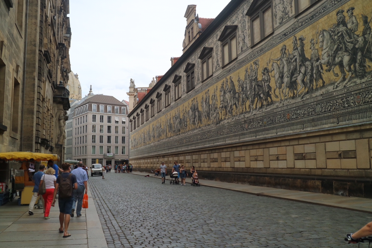 독일의 피렌체, 드레스덴을 한 눈에 볼 수 있는 성모 성당에 올라갔다 온 후 ‘군주의 행렬’을 보러 간다. 레지덴츠 궁전의 담장에 있는 멋진 이 배경은 벽화다. 1876년 베틴 왕가의 역대 군주 35명과 과학자 등 주요 인물 59명이 연대기 식으로 그려져 있다. 이 벽화는 마이센 도자기 회사가 2만 4,000개 이상의 타일을 만들어 모자이크로 만들었다고 한다. 벽화 길이만 101m이다. 벽화를 따라 걸으며 나도 행렬에 함께한다.