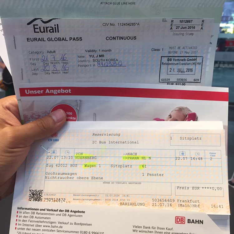 다시 프랑크푸르트를 떠난다. 드디어 유레일 패스를 개시한다. 나는 한 달간 유레일을 이용할 수 있는 글로벌 패스를 구입해왔다. 독일에서의 3주간 여행을 마치고 이제 남은 한 달간 동유럽 나라들을 여행한다. 프랑크푸르트 중앙역에서 유레일 패스를 개시하고 체코 프라하로 가기 위해 독일 뉘른베르크까지는 기차를 타고 다시 버스로 갈아탄다. 원래 계획은 어제 프라하로 떠나는 것이었는데 일주일간의 유럽 연수 스텝 활동의 피로가 가시지 않아서 하루 더 휴식 시간을 가졌다. 연수 내용을 정리하는 일도 마쳐야 해서 하루 더 시간을 냈다. 덕분에 어제 연수 내용 정리를 마치고 오늘 가벼운 마음으로 여행을 이어간다. 쉬길 잘했다. 일을 마무리 해야 여행을 이어갈 수 있다고 생각했는데 사실 그렇다. 한결 가벼워진 내 마음이 말해준다. 다시 충전된 기분으로 여행을 이어간다.