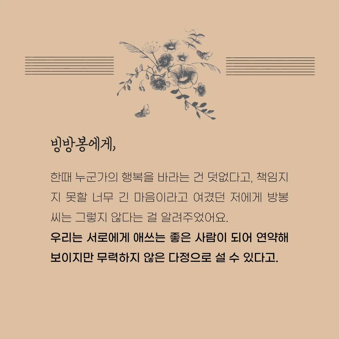 뉴스레터의 제목, <무력하지 않은 다정으로>는 제가 빙방봉에게 쓴 편지 1화에 나오는 표현이에요. 뉴스레터에서는 일상적인 이야기, 좋은 삶에 대한 고민 등 다양한 이야기를 나눌 예정이에요.