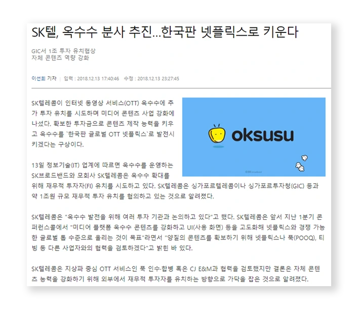 최근, SK 텔레콤은 브로드밴드로부터 옥수수의 '분사'를 결정했다. 이는 국내 OTT 시장에서 경쟁력의 우위를 확고히 하겠다는 텔레콤의 의지를 보여준다. 분사에서 비롯되는 콘텐츠 사업자로부터의 투자와, 이를 기반으로 한 오리지널 콘텐츠의 강화는 옥수수가 11번가의 성공 공식을 이어갈 수 있을 것이라는 기대감을 만들어내고 있다. 본격적으로 콘텐츠 파워의 강화와 적극적인 해외 진출을 예고하며 '한국형 넷플릭스'를 위한 기반을 다져가고 있는 것이다.
