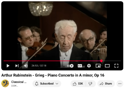 이 곡은 그리그의 인생이 담겨있다. 그냥 수사가 아니라 그는 25살 때였던 1868년에 이 곡을 처음 발표하고 수차례 개정하여 사망하기 몇 주 전인 1907년 완성했다고 한다. 무려 40년에 걸쳐 완성한 이 곡을, 나는 아르투르 루빈스타인이 1975년에 88세의 나이로 연주한 영상으로 듣는다. 그리그가 인생에 걸쳐 완성한 이 곡의 서사는, 90세를 앞둔 만년의 피아니스트의 단단하고 깊이있는 연주를 통해 가장 잘 전달된다.