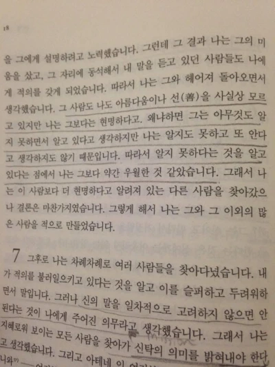 초반에는 나는 이런 염세적이고 냉소적인 피드백에 불편함을 느꼈다. 그렇지만 그와 함께 회의를 했던 그 몇개월의 시간동안, 나는 자체 서비스를 운영하기 위해서는 굉장히 많은 요소들을 종합적으로 고려해야한다는 것을 배웠다. 첫 회사를 퇴사하며 다 안다고 자만했던 내 자신이 부끄러워졌다. 결국 새로운 게임에서 나는 아무것도 모르는 거나 마찬가지였다. 그러나 모르는 그 사실보다 중요한 것은, 내가 모른다는 것을 인정하는 것이었다. 그리고 그 때 쯔음 '소크라테스의 변명' 을 읽었다.