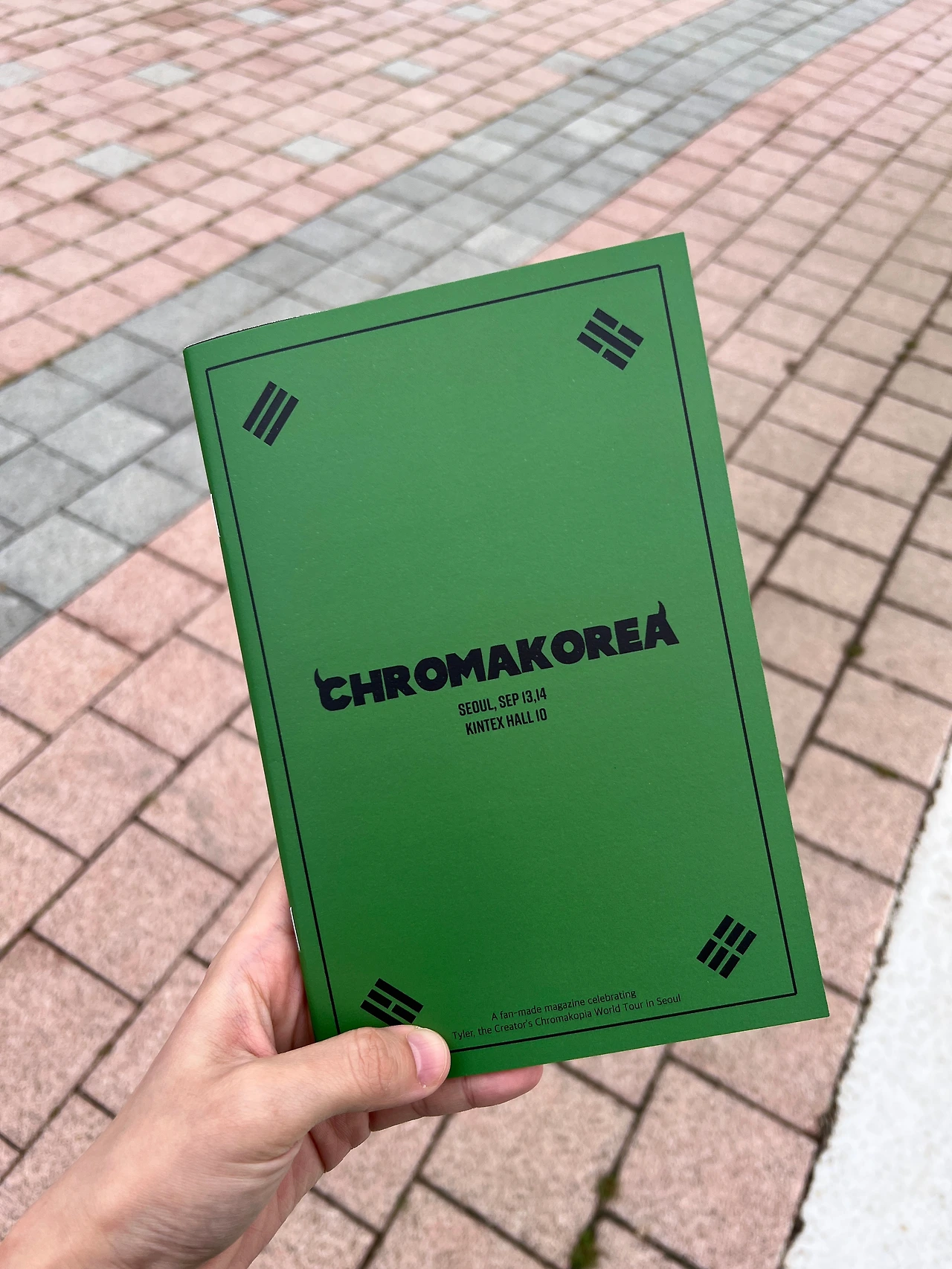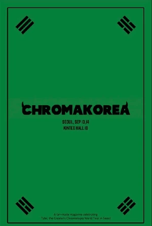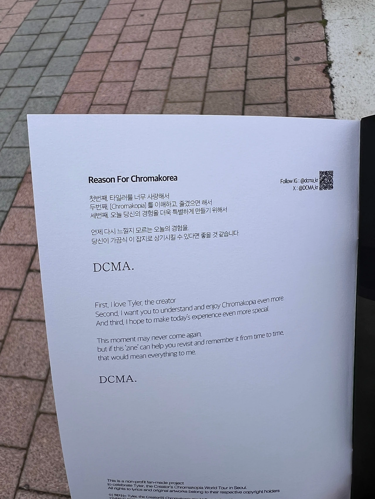 <CHROMAKOPIA>가 10월 28일에 나왔는데 제 생일도 10월 28일이거든요. 타일러 내한을 기념해서 제목은 <CHROMAKOREA>로 했어요. 여기 보시면 각 트랙들에 대한 간단한 설명들이 있어요. I KILLED YOU 가 어떤 배경에서 나온 노래인지 혹시 아세요? 흑인들의 곱슬머리가 오랫동안 차별의 대상이 되어 왔는데, 그걸 자부심의 상징으로 여기자는 노래에요. 그리고 자신의 곱슬머리를 공유할 수 있는 이 사진 프레임을 제가 만들었어요. (중략) 마지막에는 오늘 공연의 셋리스트를 적을 수 있게끔 구성했어요. 제 인스타를 팔로우하신 분들께 이 책자를 무료로 드리고 있어요. 아, 근데 오늘은 다 나눠드려서 드릴게 없는데..내일도 혹시 오세요?