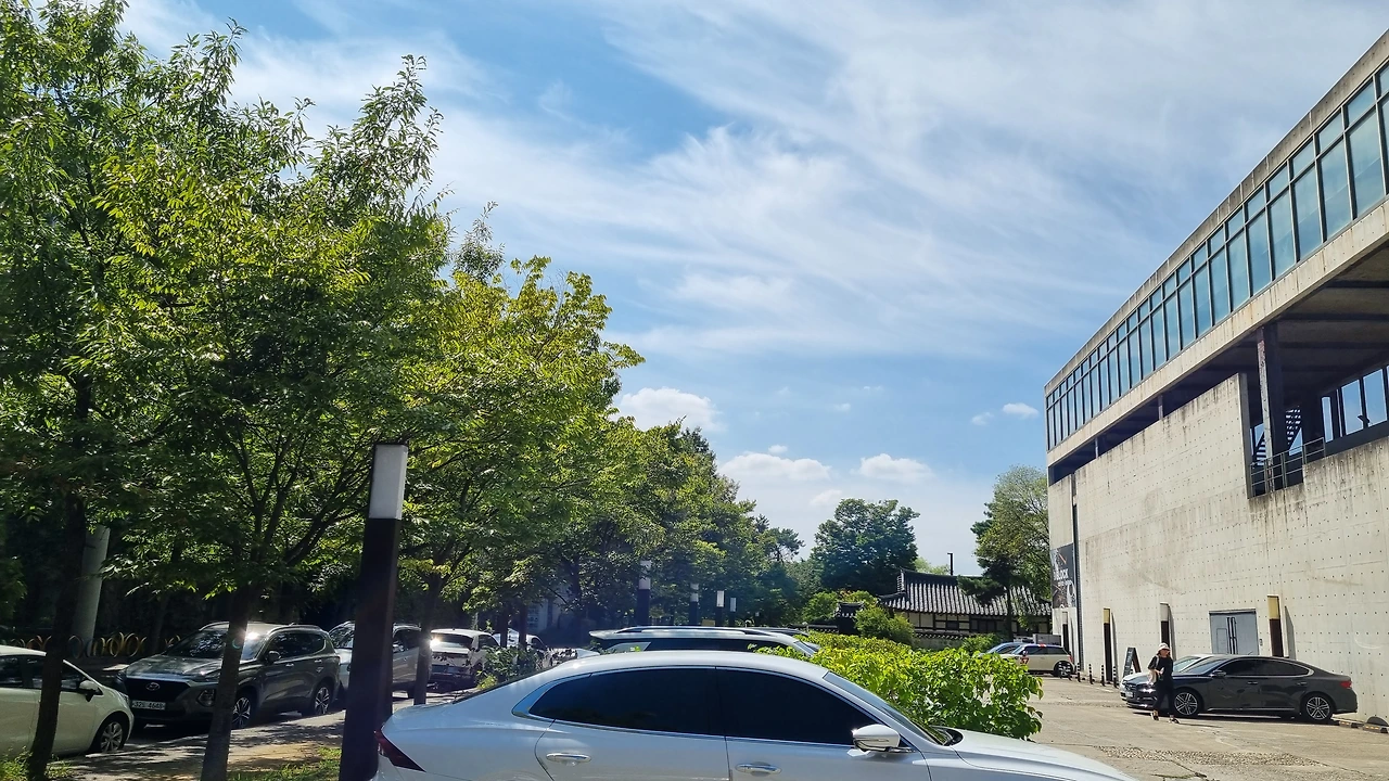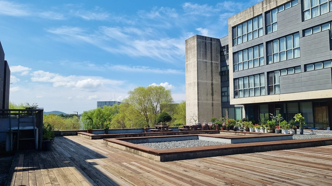 건물 사이 따뜻한 햇살이 비치고 정갈한 나무도 보였다.
