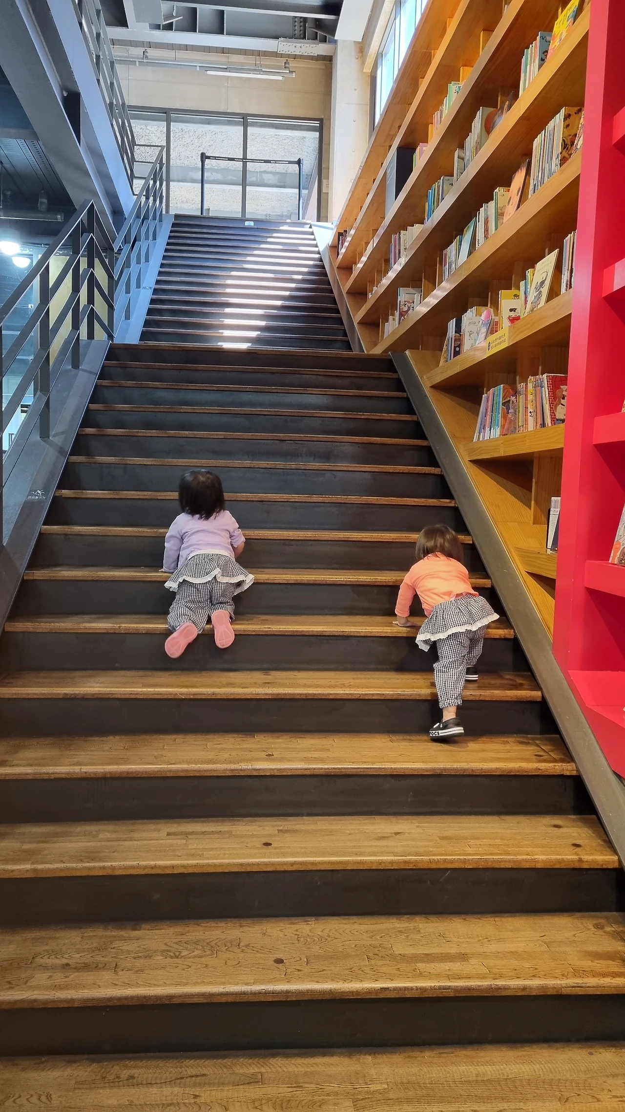 둘은 손을 잡았다가 엄마 아빠 손을 뿌리치고 엉금엉금 기어서 올라갔다.