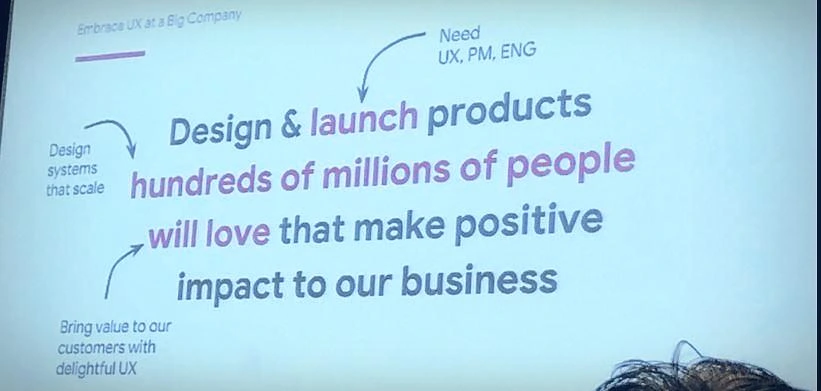 위 사진을 보면 대기업은 Scale이 하이라이트 되어있는데, 구글은 전 세계에 서비스를 해야 하므로 따라야 하는 시스템이 있고, 반드시 지켜야 하는 디자인 룰들이 있다. 모두를 위한 디자인이어야 하기에, 제약 사항이 많으며 이를 걸림돌로 여기면 대기업과 맞지 않는 것이다.