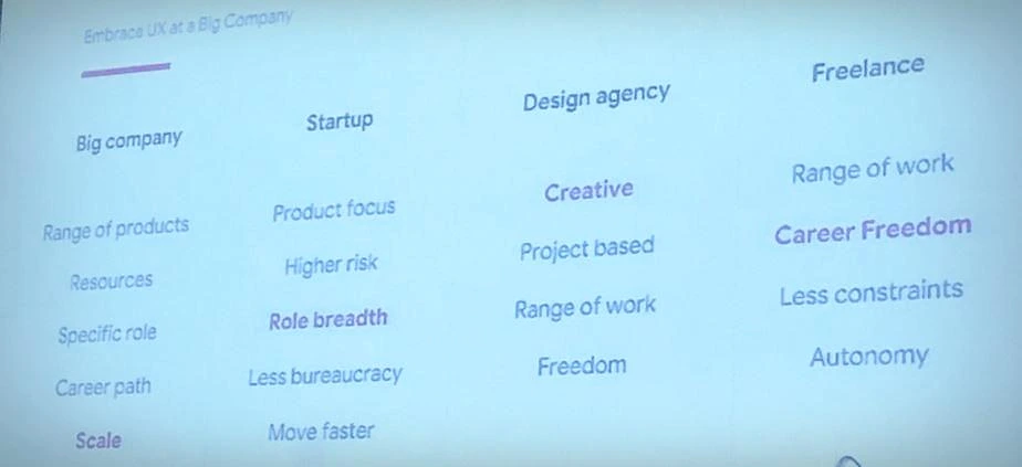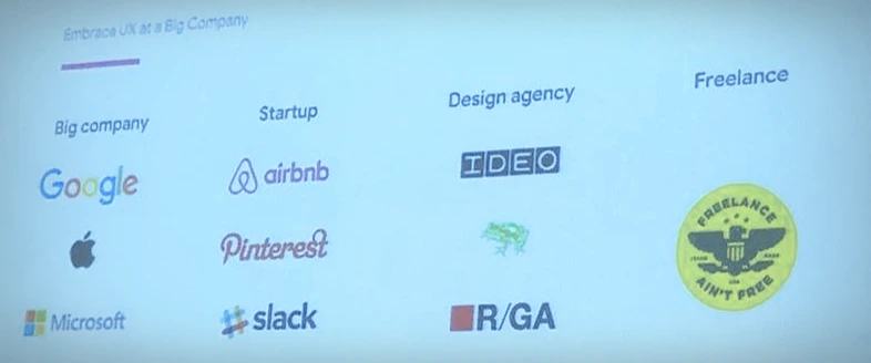 Addy는 대기업, 스타트업, 에이전시, 프리랜서 각각 디자이너에게 요구하는 능력들이 다르며, 이 것이 잘 맞아야 그 조직형태에서 일할 수 있다고 했다. "Design at Google is different from startp, design agency, or freelance'