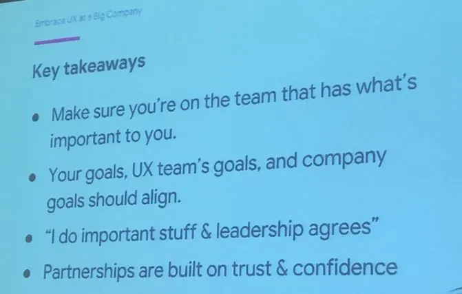 Andy Lee는 UX designer가 단순히 기획서를 받아 디자인을 하며 '비주얼 폴리싱'을 하는 것이 아닌, 팀을 리딩 하는 사람으로서의 역할이 더 크다는 것을 여러 차례 강조했다. 그리고 구글에서는 UX 디자이너가 'UX는 중요해요!'라고 설득하고 강조하지 않아도, 이미 팀 내에서 UX 디자이너의 역할이 중요하고 가치 있다는 것을 인정받기 때문에 힘들게 UX를 지키기 위해 싸워야 할 필요가 없어서 좋다고 했다.