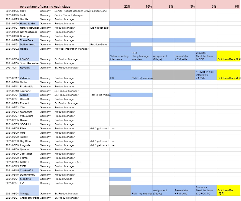 참고로 아래는 2021년 1월 25일부터 2021년 4월 5일까지 (첫 오퍼 받은 날) 지원한 회사, 진행했던 단계, 그리고 합격 현황이다. 총 1월부터 4개월이 걸렸다.