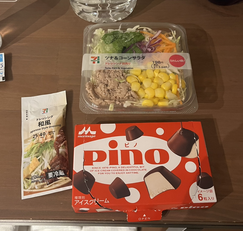 세븐일레븐에서 저녁 디저트로 모리나가 피노 아이스크림과 담날 아침에 먹을 샐러드를 미리 샀다. 편의점엔 카운터에 현금을 넣는 계산 기계가 있어서 신기했다. 피노 아이스크림은 바닐라 아이스크림에 초코 코팅인데 초코맛이 우리나라 제품들과 다르게 더 진해서 정말 맛있었다. 이날은 피곤해서 씻고 빠르게 취침.