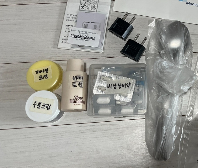 집에 있던 작은 화장품 용기나 연고 용기를 깨끗하게 씻어 말려서 로션, 수분크림, 바디로션, 클렌징오일을 소분해서 담아갔다. 헷갈리지 않게 마스킹테이프를 붙여 네임펜으로 이름을 적었다. 따로 일회용 제품을 사지 않았다. 샴푸, 린스, 바디워시는 호텔 샤워실 벽에 걸려 있는 걸 썼다.