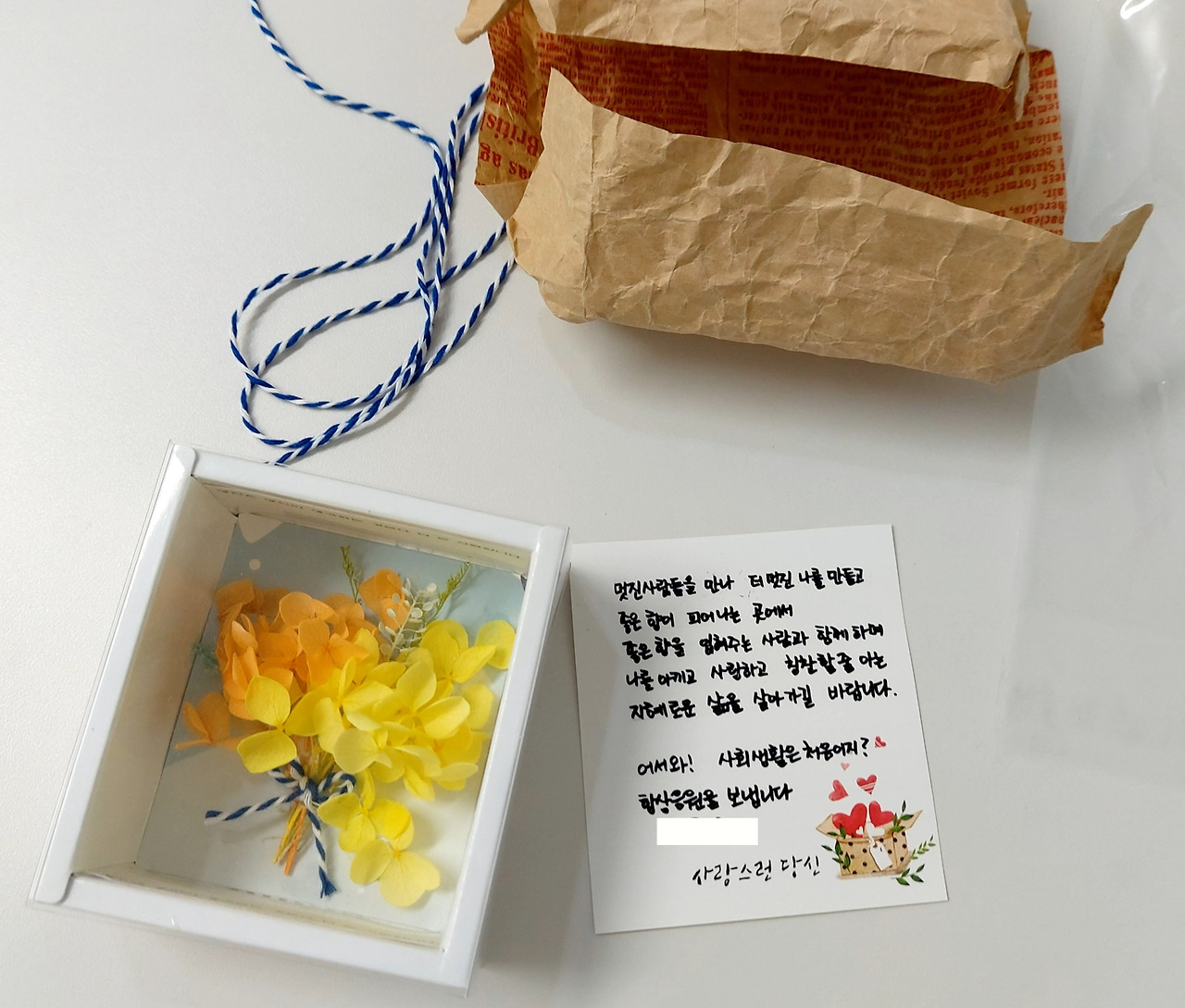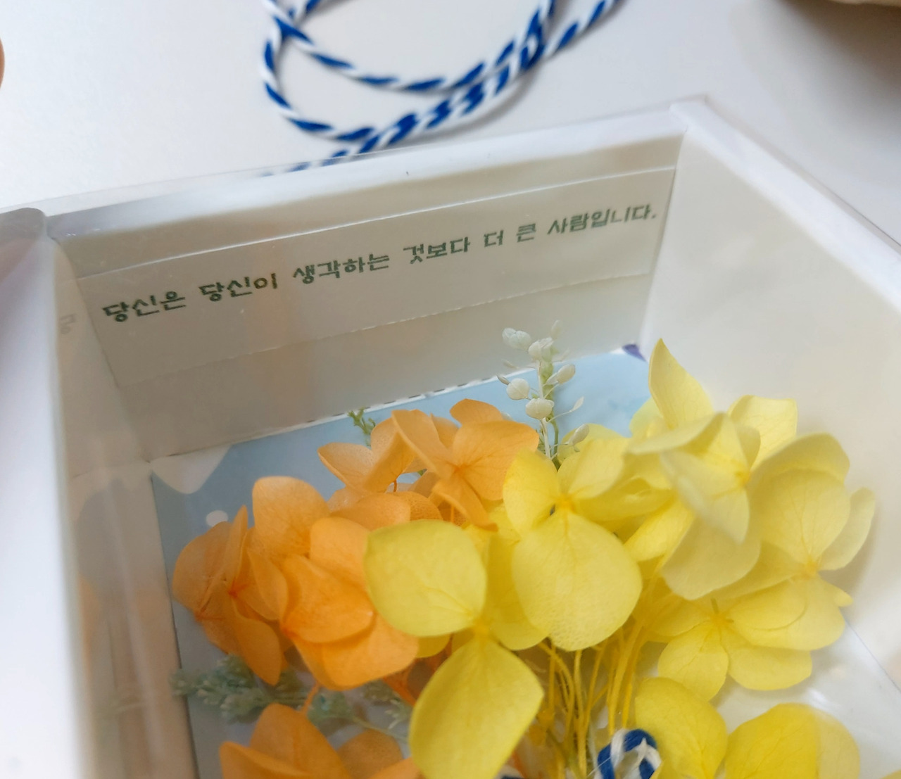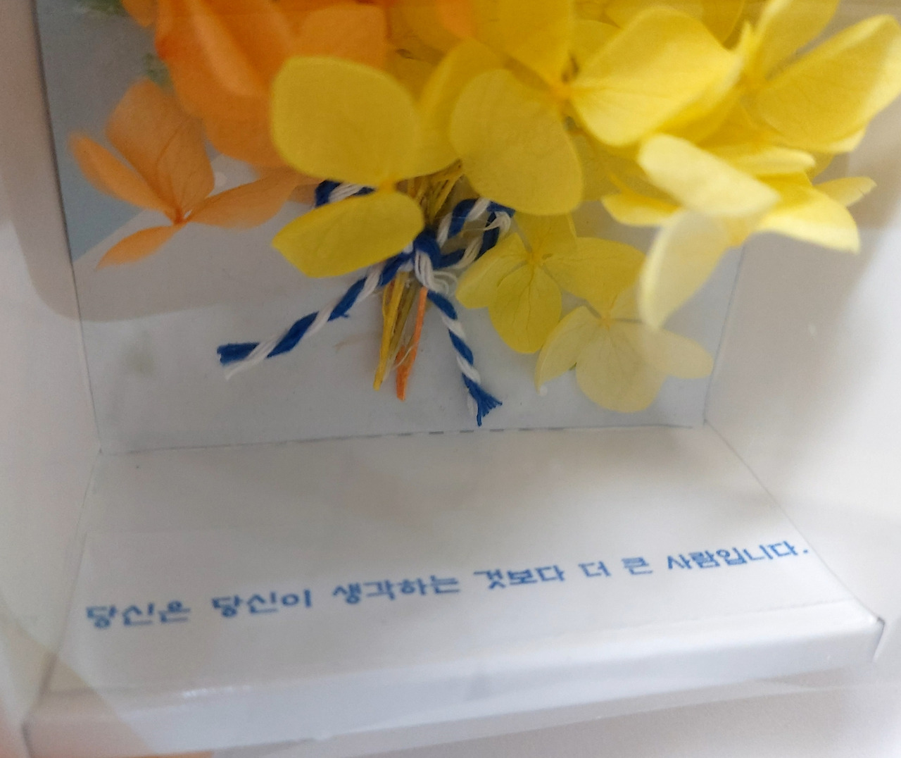 완성된 선물을 너무나 예쁘고 입가에 미소가 절로 나게 만들었지만 시작은 난장판이었다. 목공풀도 없었지만 어디선가 나타난 타일 냄비받침 세트에서 찾아냈고 말린 압화 족자와 프리져버드, 그리고 단아한 상자까지 무에서 유를 창조했던 시간이었다. 그리고 마음을 담아 오랜만에 누군가를 위해 선물을 만들었다.
