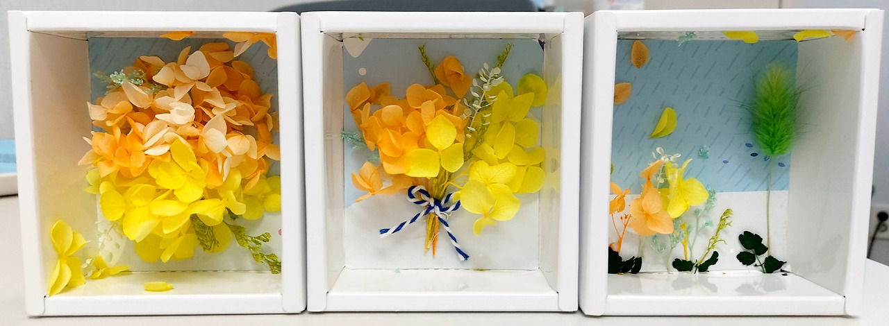 원예치료요법 때 사용한 프리져버드를 모았다. 생화를 말려 색소를 입히고 특수처리를 한 꽃과 식물들은 보고만 있어도 기분이 좋아진다. 어떻게 디자인을 할지 고민을 했다. 머릿속 디자인을 하나하나 실행했다. 첫 번째로 만든 것은 좀 미흡하긴 하나 여백의 미가 있다. 강아지풀을 사용해 복슬복슬하다. 이건 내가 좋아하는 스타일이다. 두 번째로 만든 것은 꽃다발이다. 사진으로는 좀 빈약해 보이지만 완성하고 나서 꽃잎을 더 추가해 풍성하게 만들었다. 세 번째는 꽃폭탄이다. 남은 프리져버드를 거의 다 사용했다. 목공풀로 붙이는 작업이 쉽지 않았다. 오랜만에 하는 작업이라 재미도 있었지만 생각대로 되지 않아 신경질도 조금 났다. 꽃잎이 얇고 약해서 핀셋으로 집을 때마다 부서질까 힘들었다. 실제로도 많이 부서지기도 했다. 작업을 하는 동안 너무 즐거웠다.