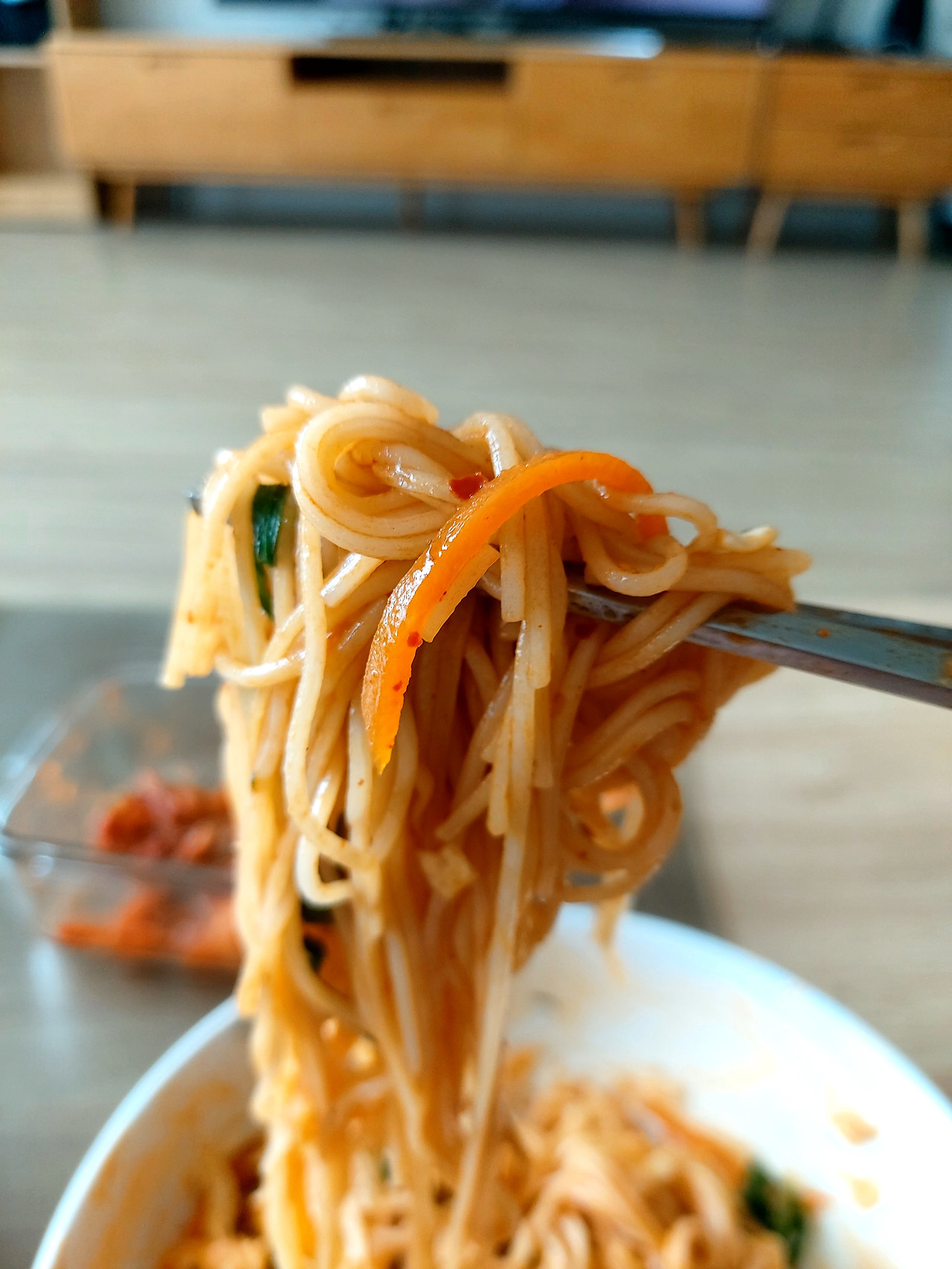 대장내시경의 여파인지 식욕이 거의 없어 억지로 연명을 위해 먹고 있는 날이 계속되었다. 저녁은 건너뛰기도 하고 점심만 구내식당에서 조금 먹는 정도였다. 어제는 선거일이라 출근을 하지 않아 밀린 일도 하고 집안일 때문인지 오후 늦게까지 잠을 잘 수 있었다. 갑자기 국수가 먹고 싶어 얼른 준비했다. 면을 너무나 사랑하지만 다이어트를 하면서 혈당을 폭발시키는 밀가루 음식은 자제를 하고 있었다. 먹고 싶은 게 생각나니 몸이 빠르게 움직였다. 마침 집에 딱 한 명 먹을 양의 국수가 있었다. 이것마저 없었다면 사러 나가기 귀찮아 또 끼니를 굶었을지도 모른다. 면을 삶을 물을 올리고 냉장고에 있는 야채를 모두 꺼냈다. 동생이 가져다준 부추와 이름 모를 외국 상추가 조금 있고 양배추, 당근볶음이 있었다. 이 정도면 훌륭한 재료다. 아들이 비빔면에서 면만 빼먹고 남긴 비빔장이 눈에 보였다. 간단하게 물 국수와 비빔국수를 동시에 만들 수 있을 것 같았다.