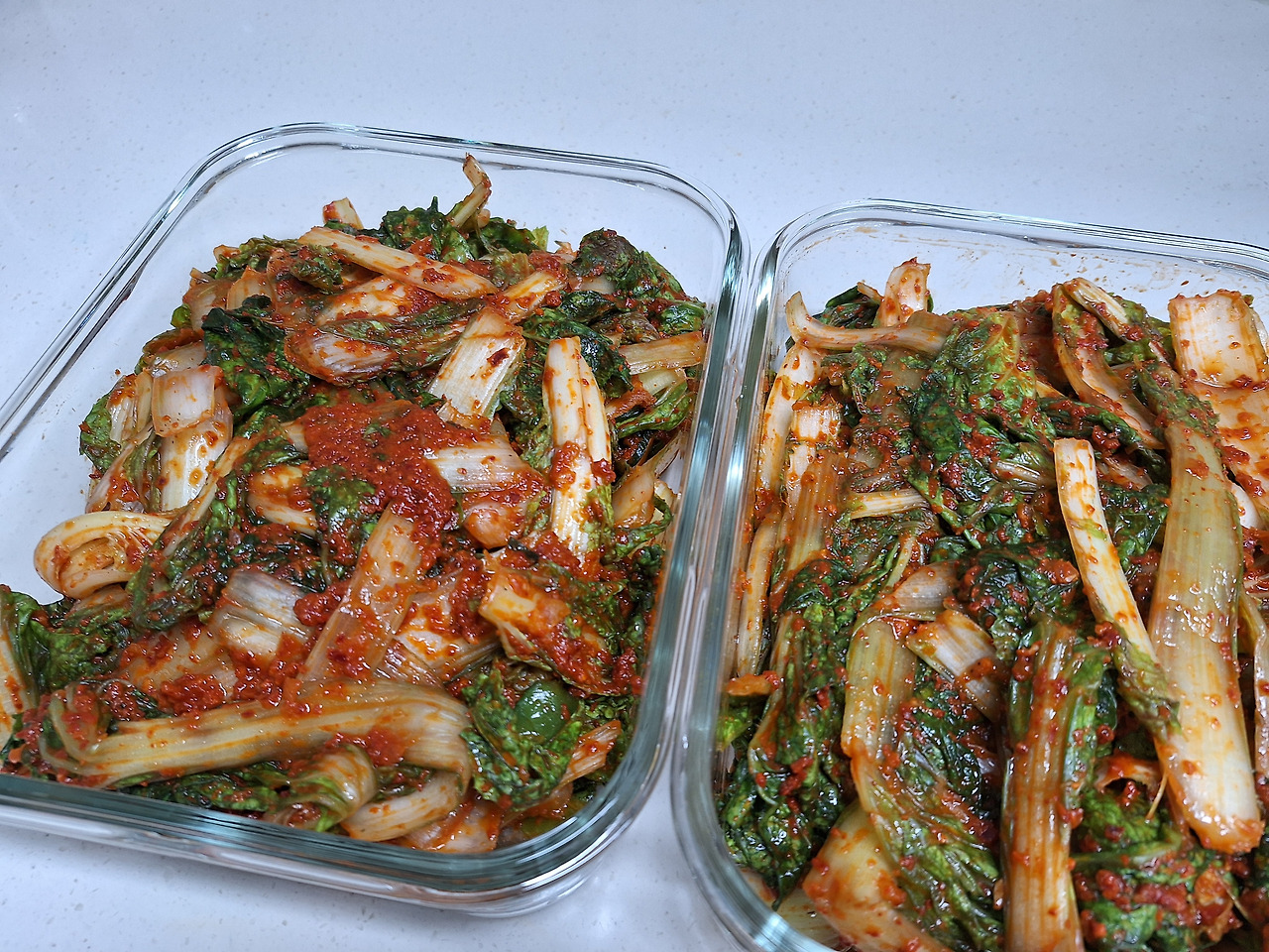 나물을 하고 남은 얼갈이는 소금을 쳐 한번 뒤집고 김치 양념을 만들었다. 퇴근 후라 몸이 녹아내리고 있어 대충 양념을 만들었다. 냉동실을 털어 이것저것 넣고 만든 빨간 양념에 씻어 놓은 얼갈이를 넣고 버무렸다.