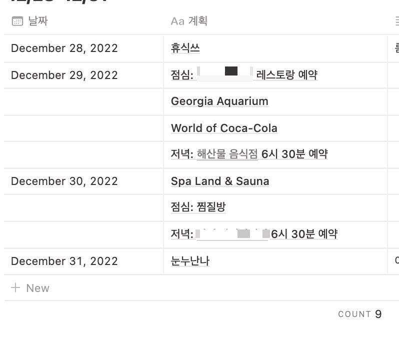 공항을 가는 차 안에서 남자친구가 말했다. 나는 좀 놀랐다. 왜냐면 계획을 꽤 야무지게 짰기 때문이다. 새삼 이 친구가 계획 세우고 지키는 것을 최고로 잘하는 J 인간임을 다시 깨달았다. 나도 정식 MBTI 테스트를 하면 J로 나오긴 하는데, 우리 둘의 티어가 다르다. 나는 상대적으로 유연하고 여유로운 성향에, 후천적으로 학습된 계획형 인간이다. 그래서 이뤄야 할 목표가 있는 공적인 일이 아닌 이상, 타이트한 계획을 세우진 않는다. 반면 남자친구는 계획과 규칙과 함께 태어난 듯하다. 뭘 하자고 하면 일단 지구 맨틀까지 뒤져서 모든 정보를 가져온다. 특히 목표가 있는 일을 하는데 매우 부지런하고 성실하고 꼼꼼한 타입이다. 하지만, 이번건은 일이 아니라 연말 휴식 여행이잖아! 아래는 우리가 함께 짠 계획표다.