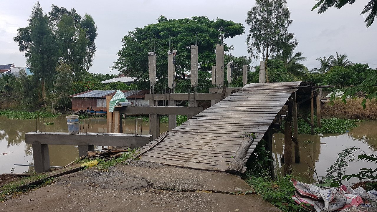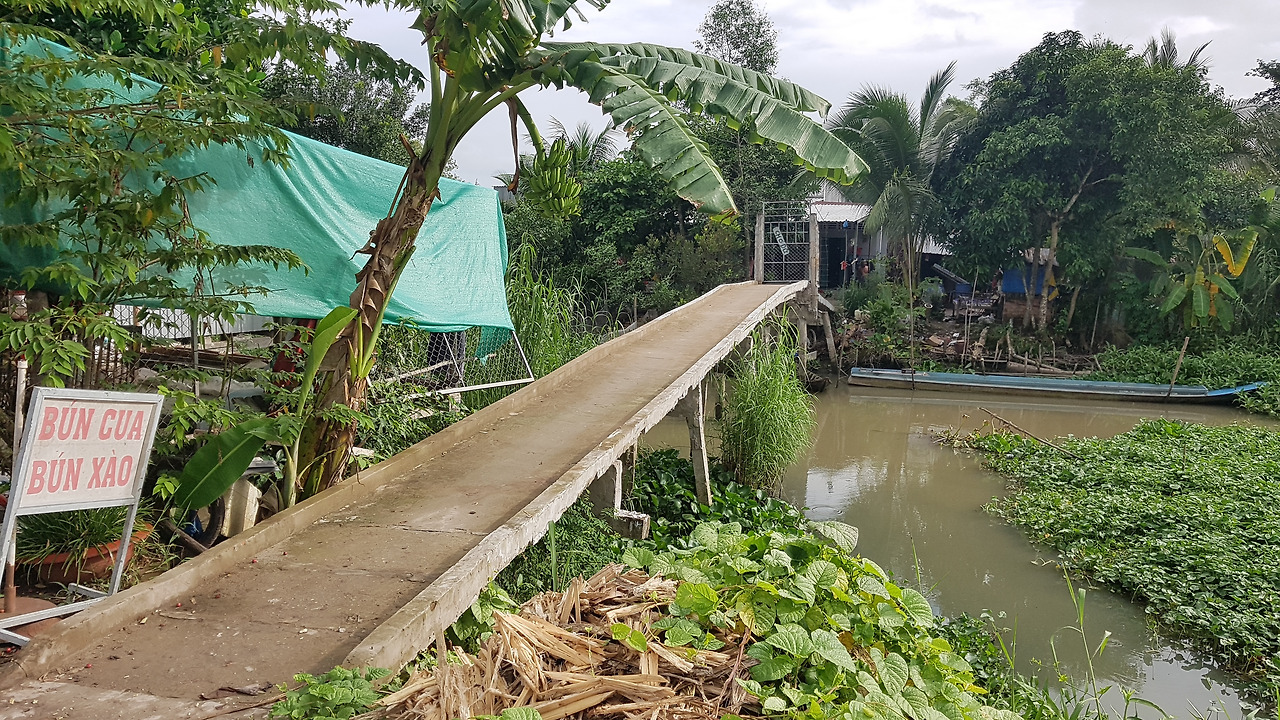 The Mekong Delta is a large plain of 4,082,000ha with rivers spreading like the fine bloodlines. No one can live a day here without crossing the river. It is a daily routine to cross the river. People cross rivers by boat on water or by car or motorbike on a bridge. There are tiny wooden bridges or cement bridges above the small rivers. It is impressive that there is a small door on the bridge.