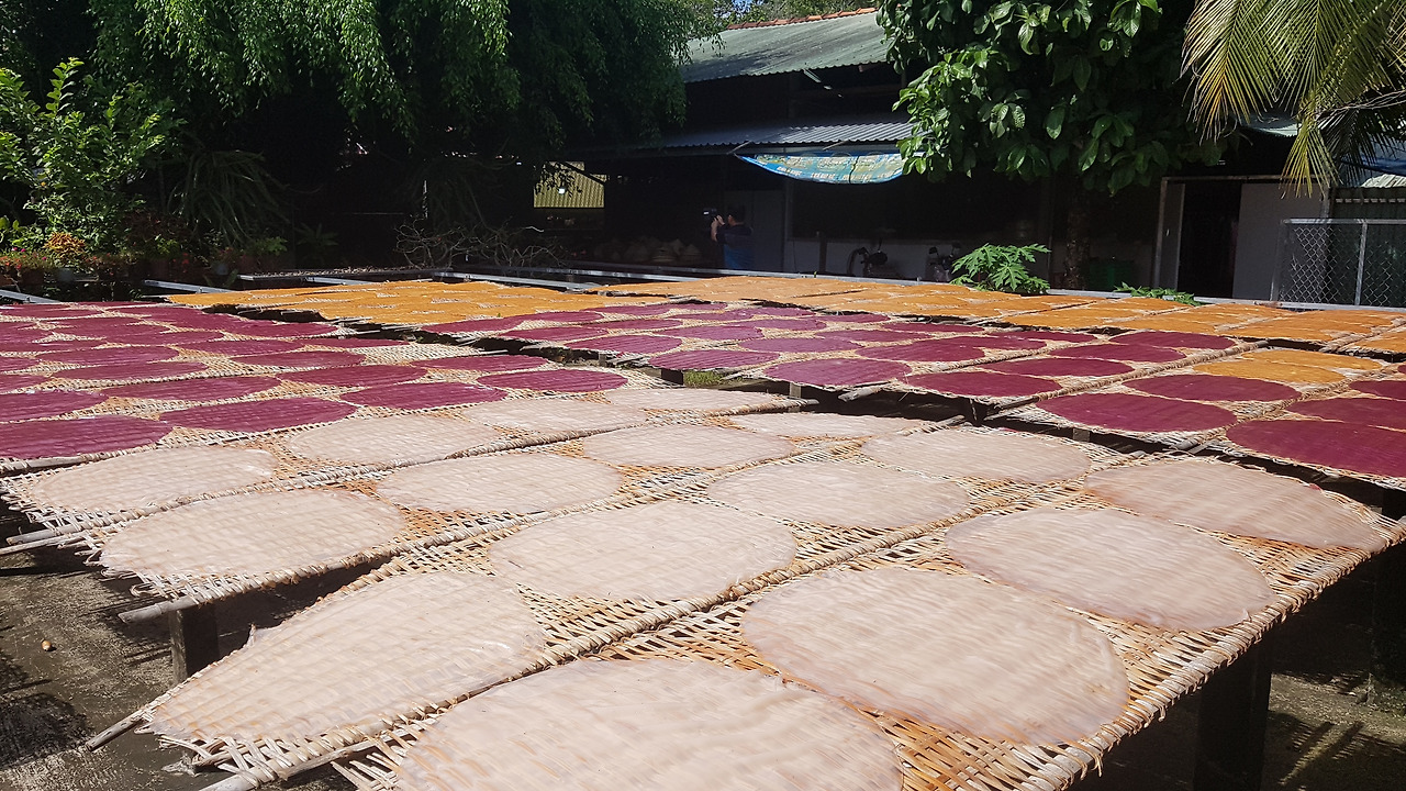 Vietnamese love to eat noodles. So do Can Tho Citizens. I wondered how to make noodles, so I visited to a traditional rice noodle factory in Can Tho. The main manufacturing processes were preparing rice flour, making dough, steaming dough thinly in the oven, taking out steamed pancakes and drying them in the sun, putting dried ones in a noodle-making frame and collecting noodles that come under the frame. The machine is only a frame for noodles and all the work is done by hand.