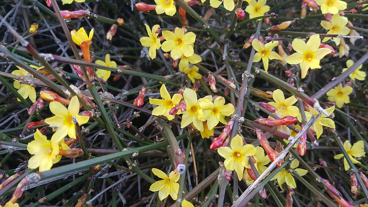 Jasminum nudiflorum(Winter Jasmine) flowers, which tell the coming of spring, are in full bloom.