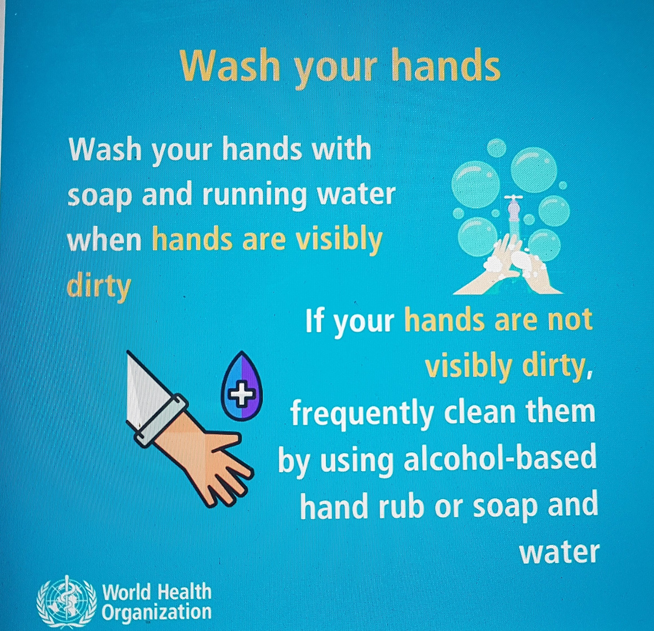 일반인에 대한 WHO의 권장 내용에는 ⓵ 비누와 물 또는 알코올을 기초로 한 소독 약제를 사용하여 자주 손 깨끗이 씻기, ⓶기침이나 재채기 하는 사람과 1m이상 거리 유지하기, ③오염된 손으로 눈, 코, 입 만지지 않기, ④기침이나 재채기 할 때 소매나 휴지로 입과 코를 가리고 하기, ⓹ 몸 상태가 안 좋으면 집에 머물고, 발열, 감기, 호흡곤란이 있으면 의료기관에 연락하고 의사 처방에 따르기로 되어 있다.