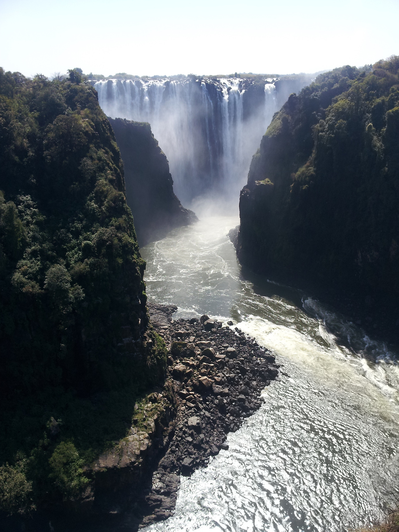 빅토리아폭포는 잠베지 강(Zambezi river)이 절단되어 빅토리아협곡 아래로 떨어지는 자연이 만든 세계최대의 워터스크린 Water screen, 水幕)이다. 이것을 보기 전에는 폭포는 산의 계곡물이 낭떠러지를 떨어지는 것으로 알았고 그런 폭포만을 보아왔다. 그러나 폭포에 대한 나의 개념이 바뀌었다. 폭포는 거대한 강이 90℃로 휘어 협곡절벽 아래로 떨어지는 것일수록 아름답고 장관(壯觀)을 이룬다고.