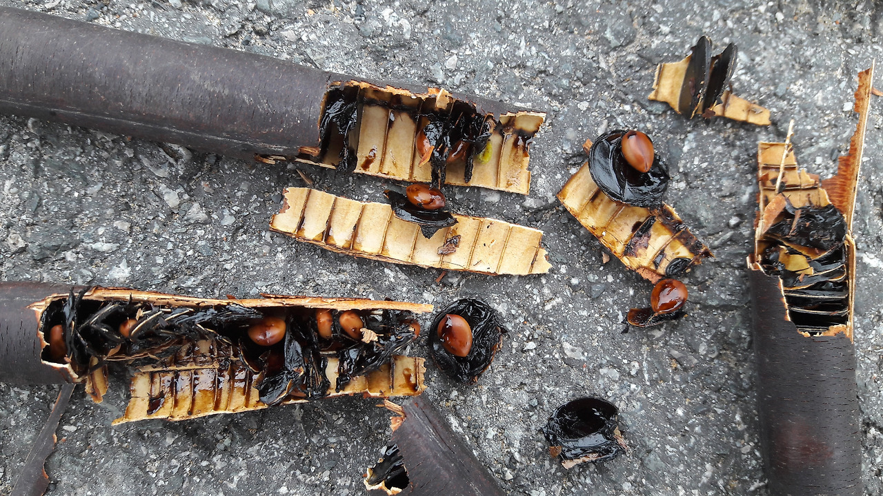 다른 한 가지는 빗물에 의한 이동이다. 내가 관찰한 바로는 떨어진 열매 껍질이 썩거나 부서져 씨가 나오