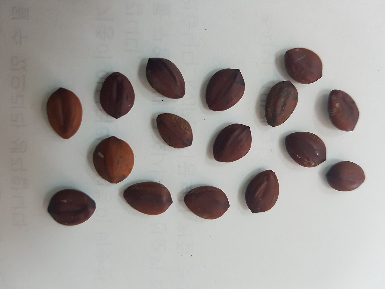 .씨: 씨는 납작 도톰한 타원형이다. 크기는 길이6~10mm, 너비4~5mm, 두께2~3mm다. 익지 않은 초기 씨는 흰색이며 겉이 매끄럽고 부드러우나 익으면 적갈색, 흑적갈색이 되고 딱딱하고 단단하다.