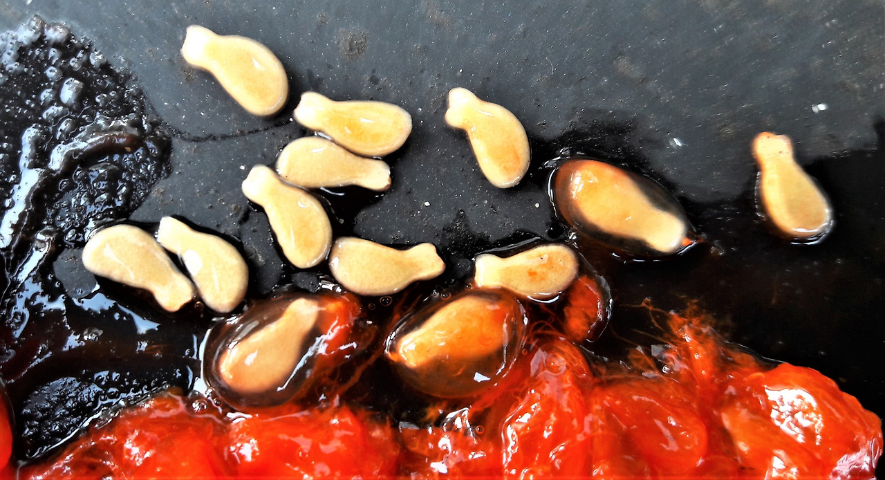 .씨: 씨는 길이4~6mm, 너비1.5~2.5mm의 납작하고 좁은 쪽이 약간 굽은 조롱박을 닮았다. 열매 육즙에 싸여 있을 때는 연노란 백색에 가까우나 마르면 회백색에 가깝다.