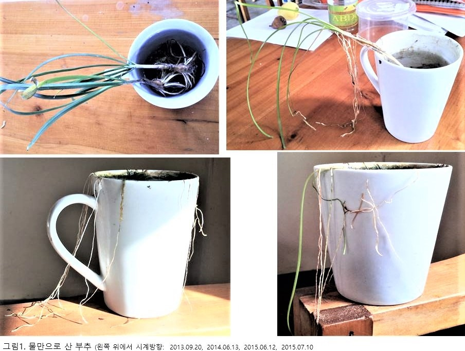 2013년9월20일에 물 컵에 부추 2대를 넣고 물을 부어 거실에 놓았다. 가끔 물이 마르지 않도록 물만 주었다. 그런데 한 달, 여섯 달이 지나도 부추는 살아 있었다. 신통방통하여 관심을 갖고 키우다 보니 1년이 넘었고, 1년9월이 되던 2015년 6월12일에 한 줄기 잎만 남아 있다가 2015년7월10일에 마지막 잎마저 시들어 죽었다. 장장 1년10월 만이다. 부추는 정말 생존력이 강한 식물이었다.