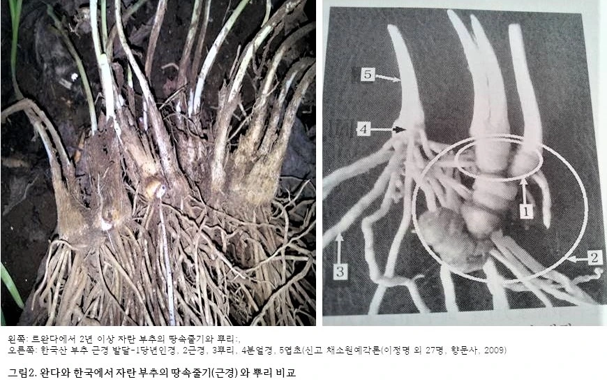 ▴또 한 가지 흥미로운 것은 부추의 땅속줄기 발달양상이 열대와 온대에서 다르다는 사실을 발견했다. 부추는 한국에서는 겨울을 지나면 지난 해 만들어진 땅속줄기는 굵어져 혹처럼 변하고 새로운 땅속줄기가 또 생기는데 르완다에서는 한 해가 지나도 땅속줄기가 굵어져 혹처럼 되지 않았다. 이와 관련된 자료를 찾아보았지만 아직 찾지 못했다.
