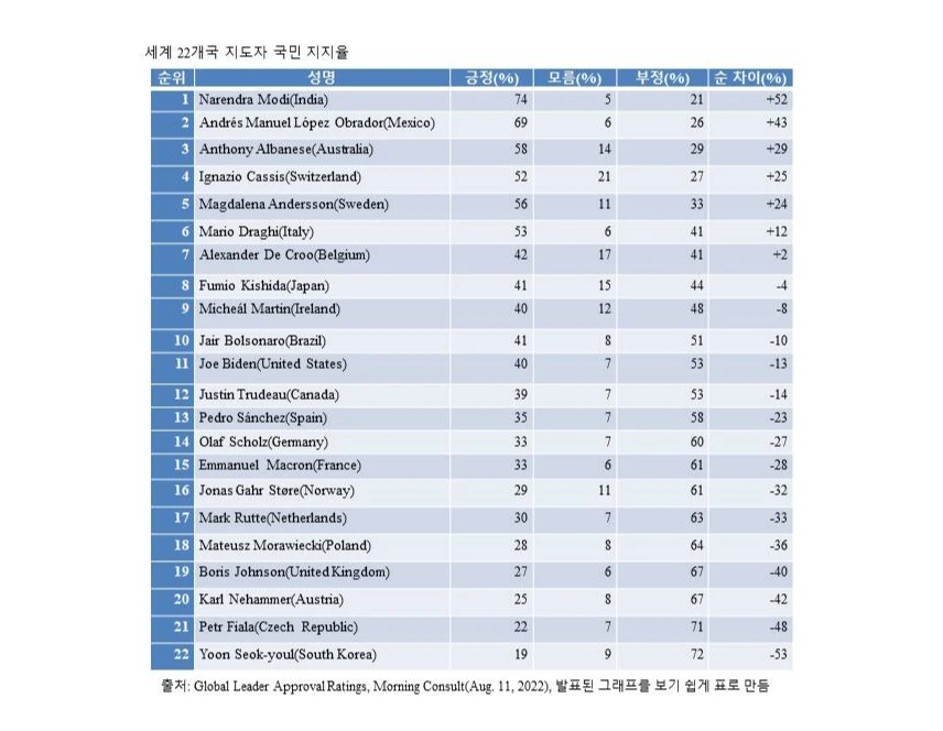 미국의 글로벌의사결정지능회사(Global Decision Intelligence Company)인 모닝 컨설트(Morning Consult)는 2022.08.11일자로 G7를 포함한 세계 주요 22국가의 지도자에 대한 국민지지율 조사결과를 발표했다. 발표에 따르면 인도 모디가 긍정74%로 1위, 미국 바이든은 긍정40%로 11위이고 한국 윤석열은 긍정19%로 꼴찌인 22위였다. 22개국 지도자에 대한 국민의 긍정, 부정 율과 순위는 아래 표와 같다.