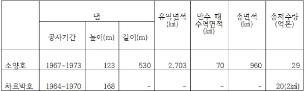 이해를 돕기 위하여 한국의 소양호와 우즈베키스탄의 차르박호수를 비교해보면 아래와 같다.
