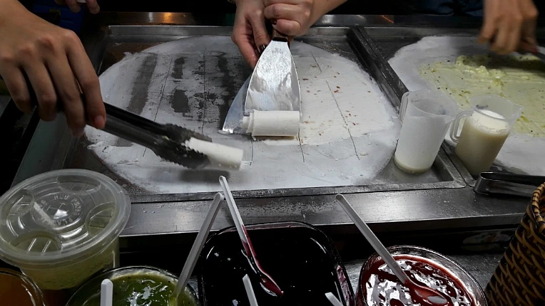 먹고 싶은 망고아이스크림을 주문했다. 앳된 아가씨들이 과일 망고 몇 조각을 철판 위에 놓고 납작하고 넓은 칼로 잘게 썰고 다졌다. 그런 후 우유를 그 위에 붓고 다시 칼을 두드려 섞고 다졌다. 그러다보니 과일과 우유가 섞이고 짓이겨져 죽처럼 되었다. 이것을 철판 위에 얇게 펴니 금방 아이스크림이 되고, 이것을 칼로 4~5개로 자른 뒤 앞에서 뒤로 미니 말린 아이스크림으로 변신했다.